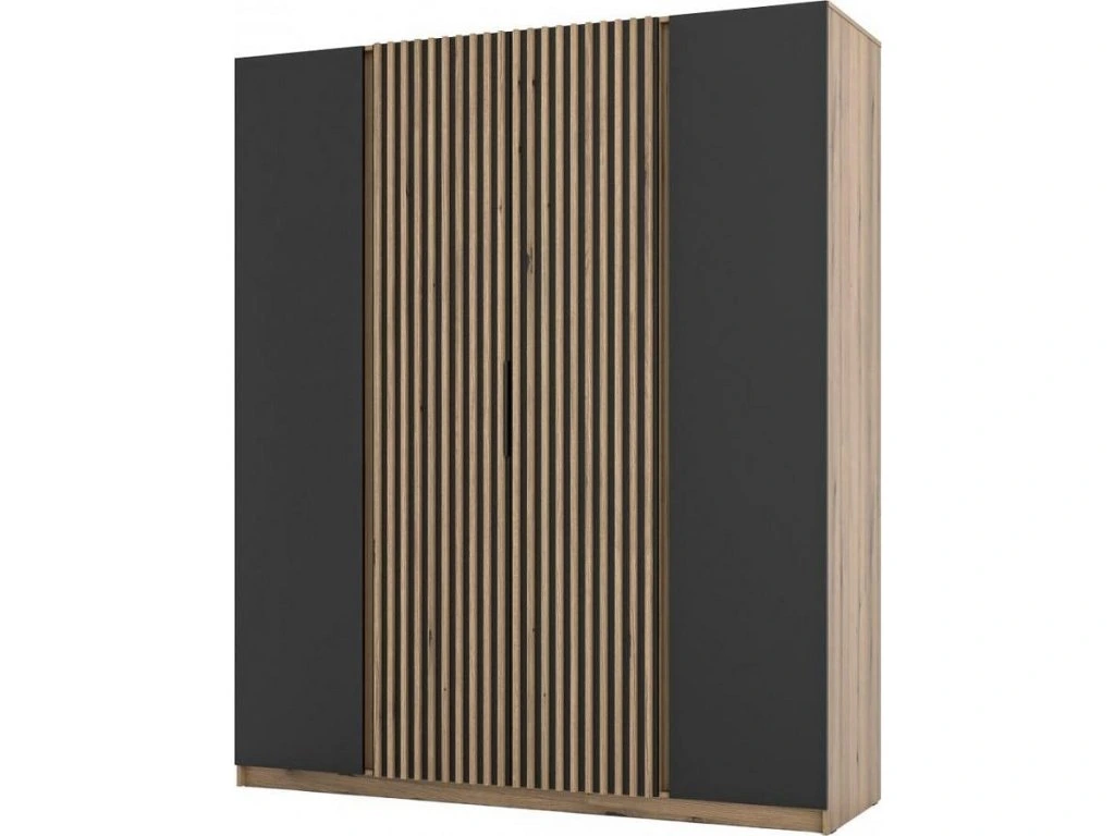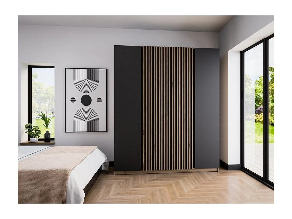 Šatní skříň Keny XIII v moderním designu má šířku 200 cm a je rozdělena na tři praktické části. Vnitřní uspořádání kombinuje závěsnou tyč a 11 polic, což umožňuje přehledné a praktické rozdělení šatníku.