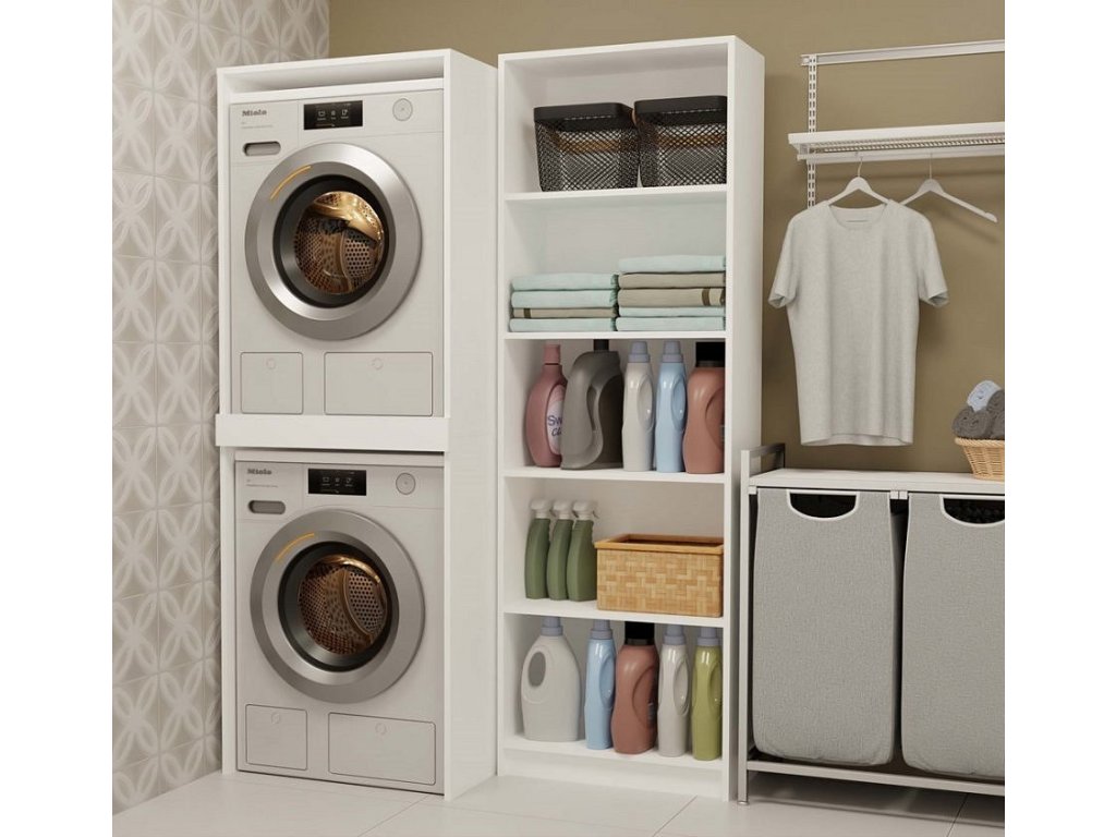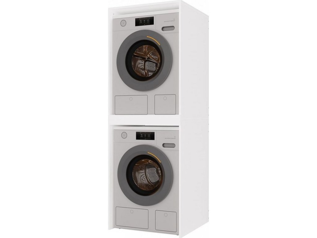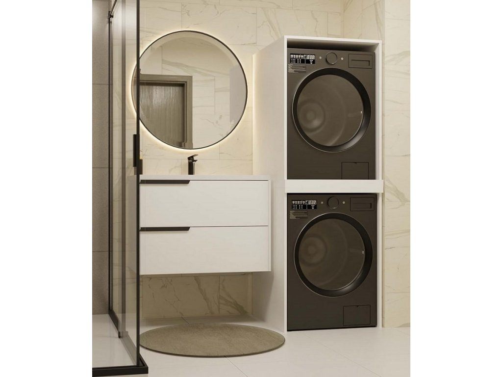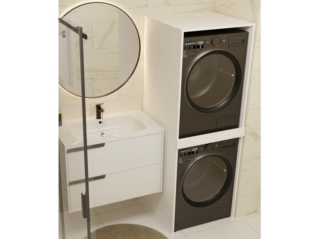 Moderní koupelnová skříňka Pema TWIN v minimalistickém designu je dokonalým řešením pro malé koupelny. Splní očekávání všech, kteří hledají praktická řešení. Zesílená police s dodatečnou podpěrou zajistí stabilní a bezpečné umístění pračky a sušičky na sebe. Je vyrobená ze snadno udržovatelného lamina, hrany jsou zakončené vysoce odolným ABS materiálem.