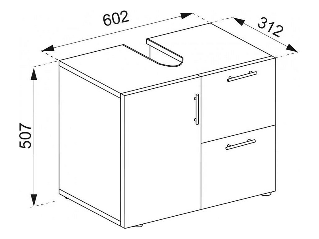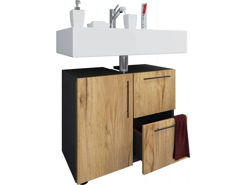 Moderní koupelnová skříňka Flandu od značky VCM je praktický a stylový kousek nábytku do koupelny, který se díky svému provedení ve struktuře dřeva hodí do každého interiéru. Jako koupelnová skříňka pod umyvadlo nabízí dostatek úložného prostoru díky dvěma hladce výsuvným zásuvkám a jedněm otočným dvířkům, takže všechny koupelnové potřeby máte vždy po ruce. Kvalitní melaminový povrch je odolný vůči vlhkosti a velmi snadno se udržuje, což je ideální pro koupelnový nábytek, který musí zvládat každodenní provoz.