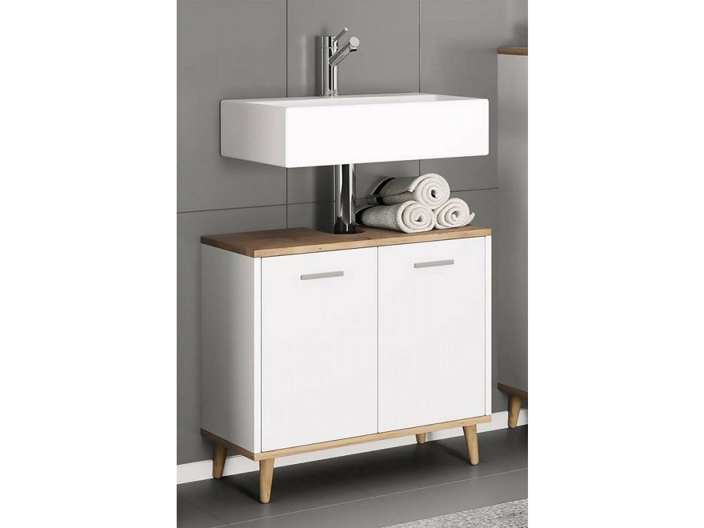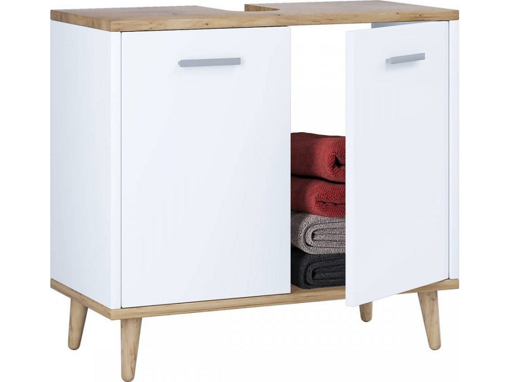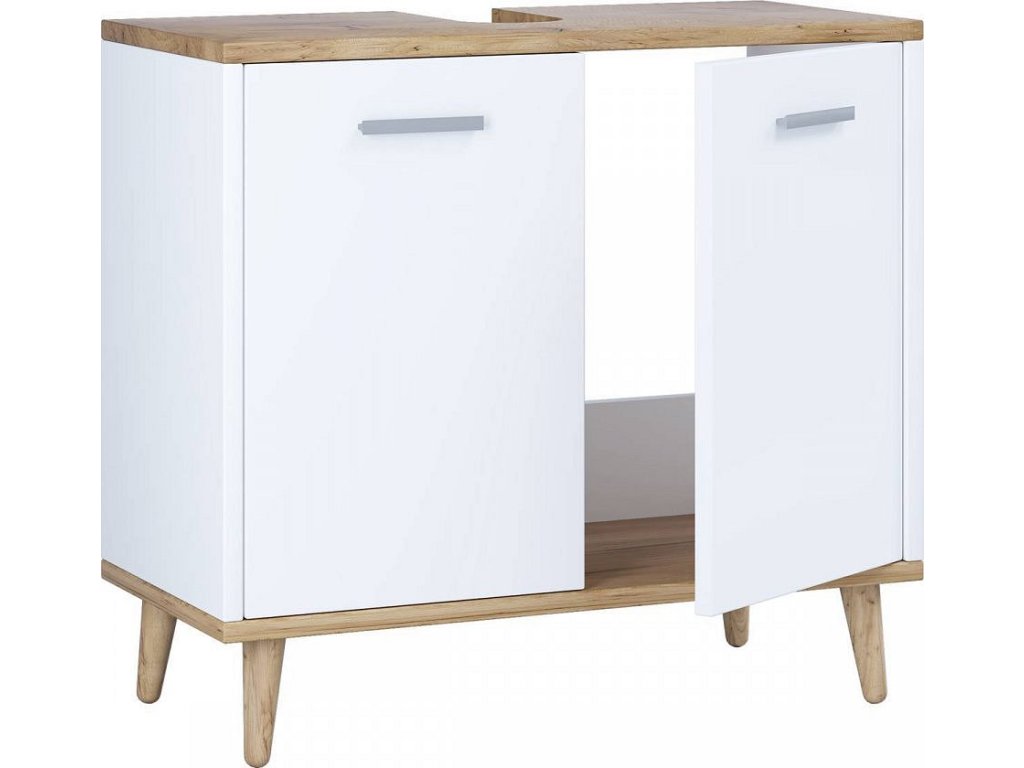 Moderní koupelnová skříňka pod umyvadlo VCM Landos je praktický a elegantní prvek, který doplní jak moderní, tak klasický interiér. Díky nadčasovému jednoduchému designu se snadno kombinuje s dalším nábytkem do koupelny. Skříňka disponuje dvěma otočnými dvířky a poskytuje prostorné úložné místo pro hygienické potřeby a doplňky.