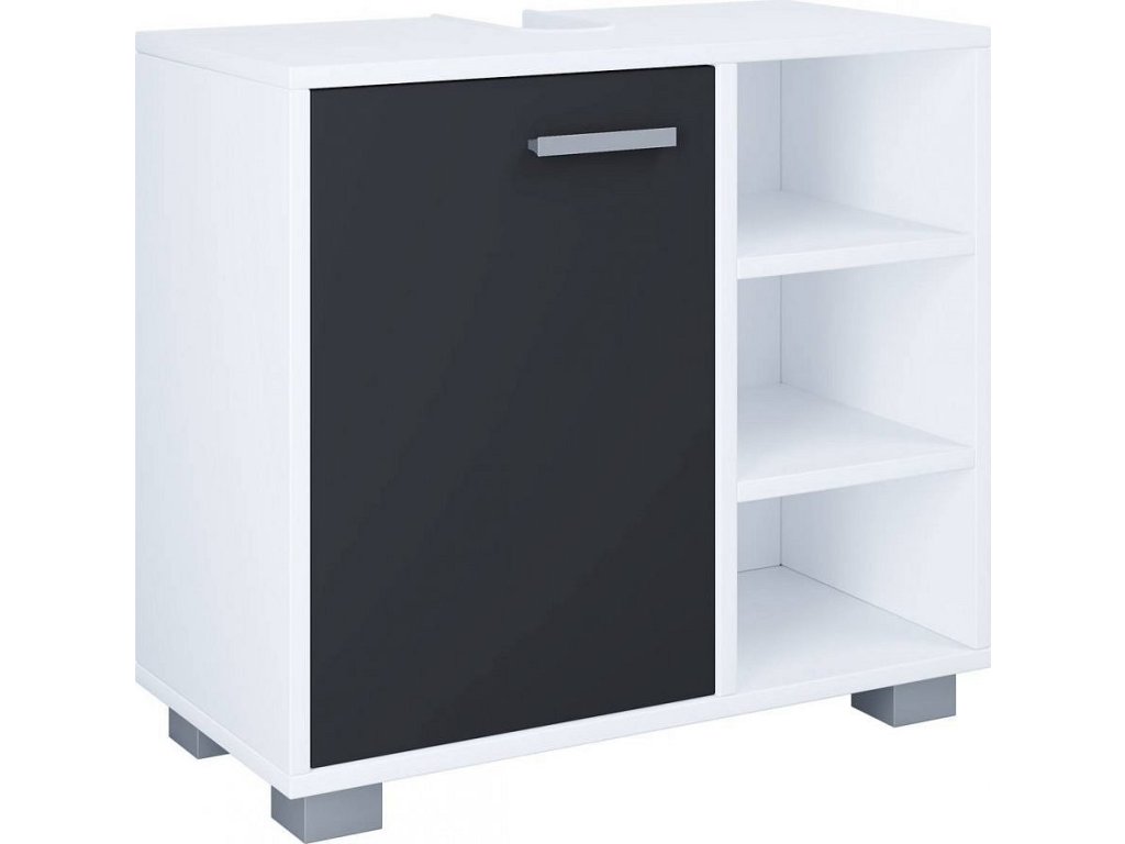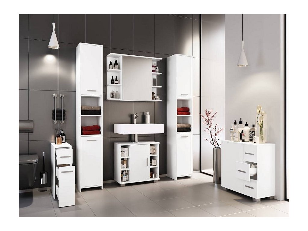 Skříňka nabízí tři otevřené přihrádky, jedna otočná dvířka a prostorný vnitřní úložný prostor, kam snadno uložíte ručníky, kosmetiku i drobné doplňky.