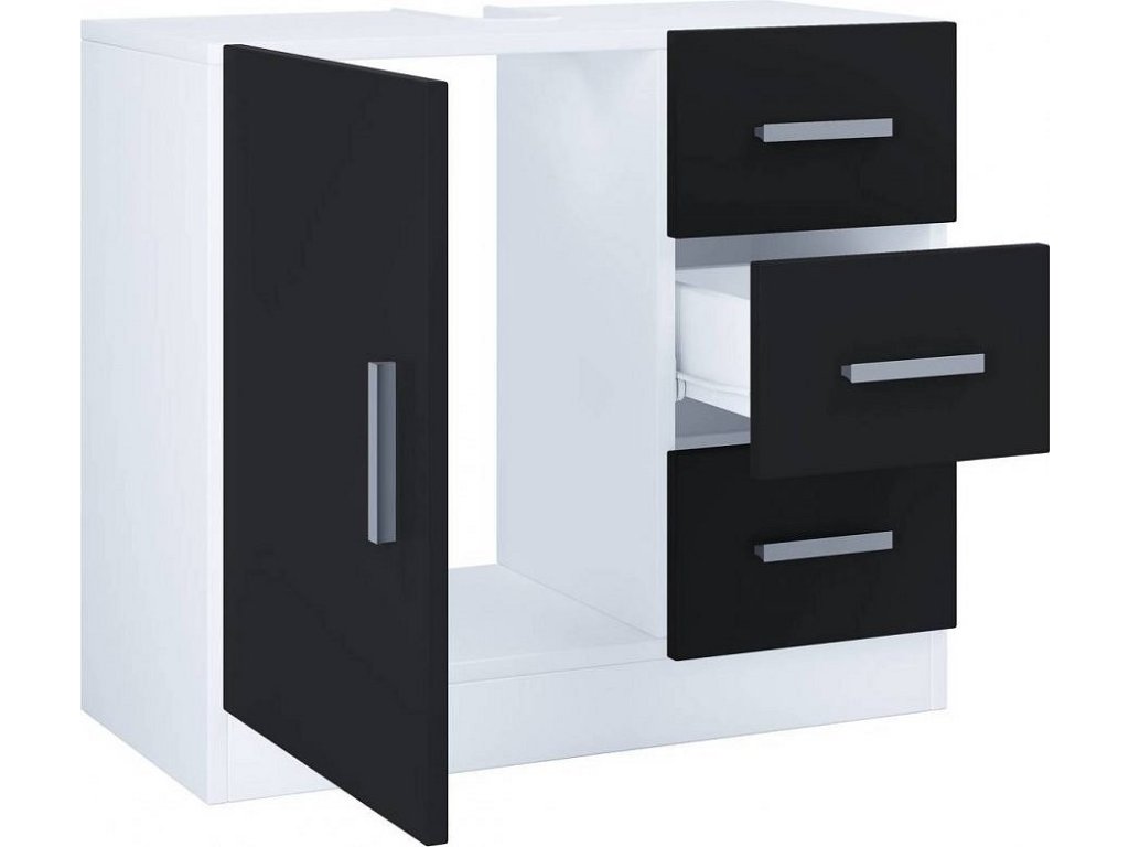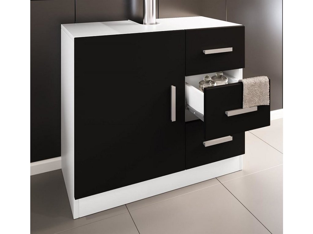 Skříňka nabízí tři prostorné zásuvky a jedna dvířka s velkým úložným prostorem, kam snadno uložíte ručníky, kosmetiku nebo čistící prostředky.