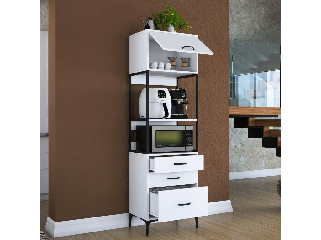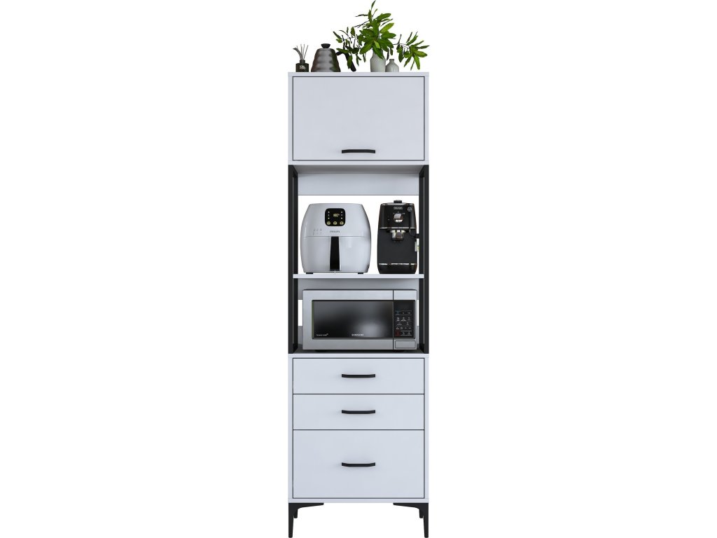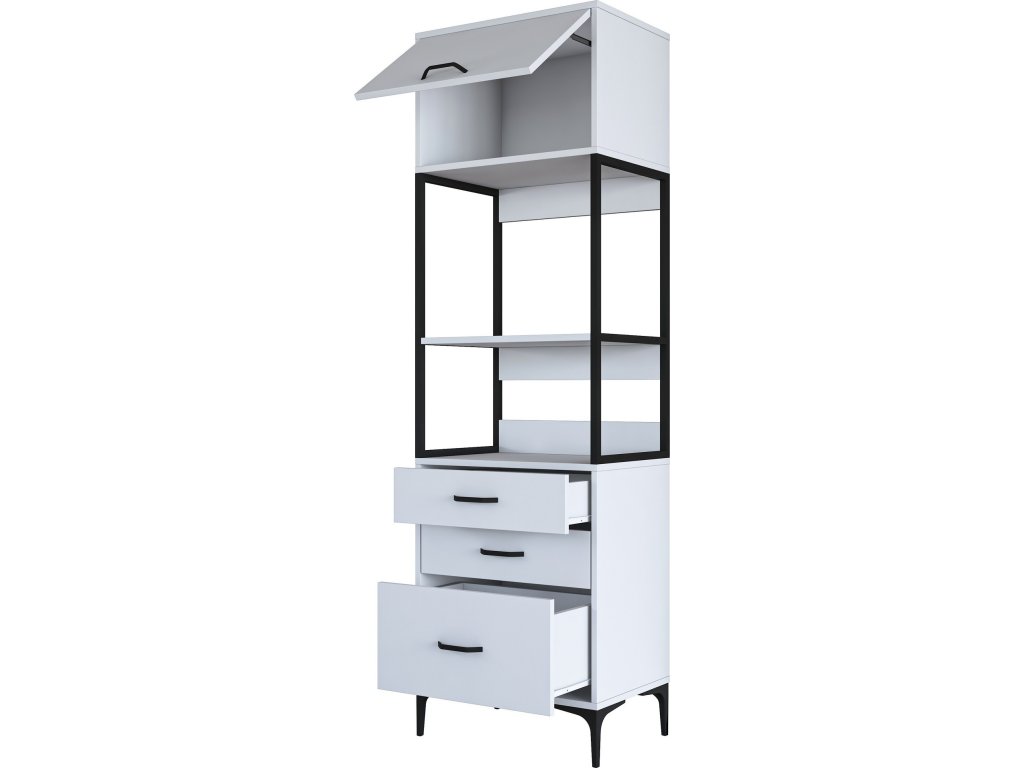 Skříň nabízí kombinaci úložných prostor v podobě jedněch plných dvířek, tří prostorných zásuvek a praktického regálku, který je ideální pro vystavení nebo snadný přístup k často používaným předmětům. Díky své výšce je skříň vhodná i do menších koupelen, kde pomáhá maximálně využít dostupný prostor.