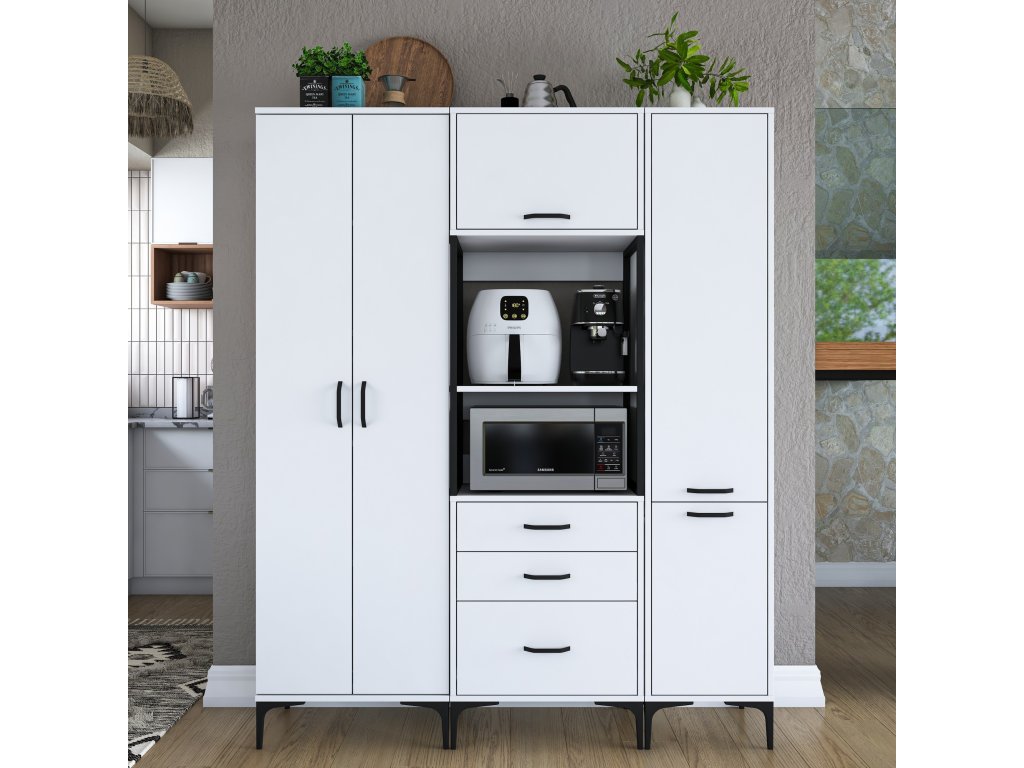 Skříň nabízí promyšlené uspořádání úložného prostoru, které zahrnuje pět plných dvířek, tři zásuvky a regálek. Je navržena tak, aby poskytovala dostatek místa pro mikrovlnnou troubu, kuchyňské spotřebiče i další předměty, které potřebujete mít po ruce.