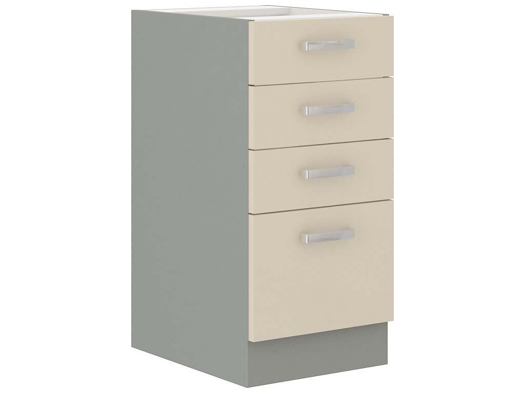 CASA 87001 Dolní skříňka se 4 zásuvkami KARMEN vyrobená z kvalitního lamina a MDF. Korpus i sokl ( 10 cm ) jsou v barvě šedá a dvířka v barvě karmen krémová v lesku. Rozměry skříňky - šířka 40 cm, výška 82 cm, hloubka 52 cm ( s pracovní deskou zabere 60 cm ). Vzadu se nechává volný prostor. Pracovní deska není v ceně. Úchyty jsou z kovu. V naší nabídce naleznete další výběr skříněk k sestavení celé kuchyně.