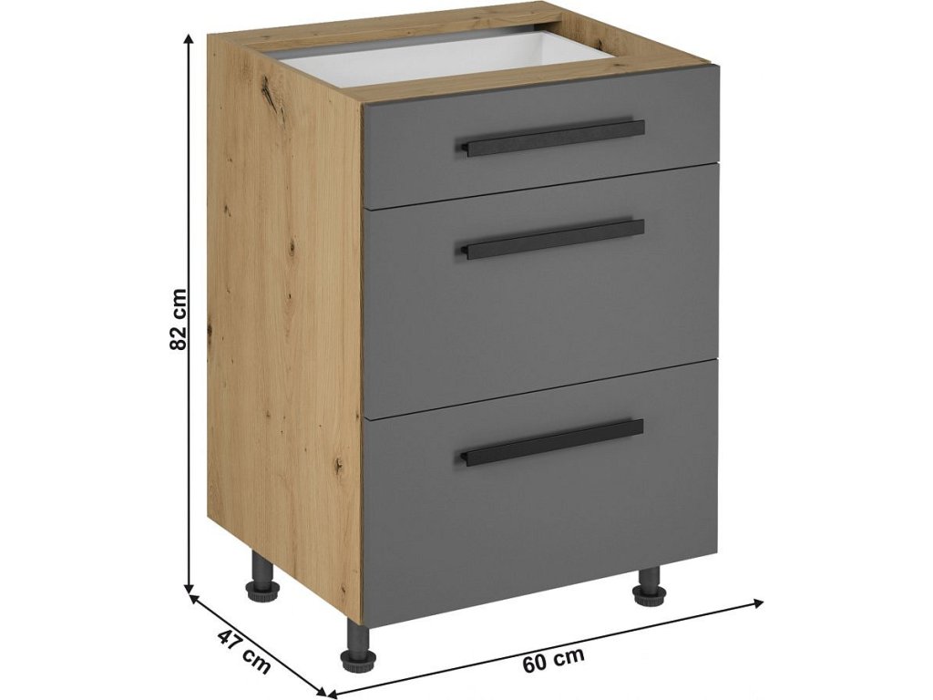 Spodní kuchyňská skříňka LANGEN D60S3 se šuplíky, dub artisan/šedý mat, s úchytkami