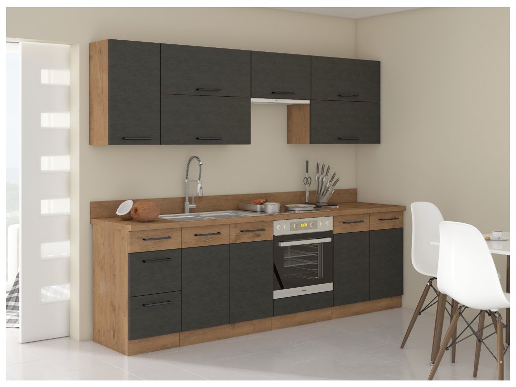 Spodní skříňky jsou dodávány včetně dolní lišty, bez pracovní desky. Možnost dokoupit pracovní desku dub lancelot v ceně: 1590 Kč/bm. Možnost dokoupit univerzální L / P dřez LAY ON.