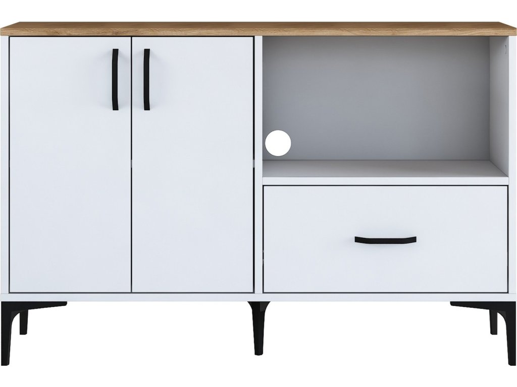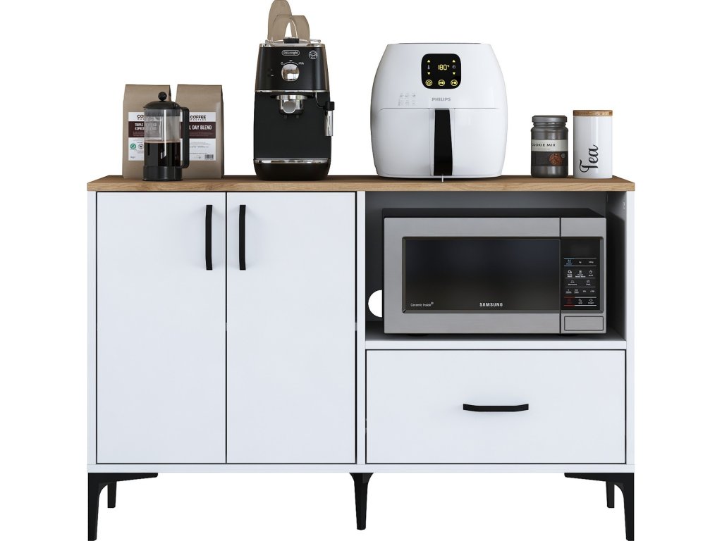 Skříňka je ideální pro umístění mikrovlnné trouby, a přitom nabízí další praktické úložné prostory. Je vybavena dvěma plnými dvířky, jednou zásuvkou a otevřeným regálkem pro snadný přístup k často používaným předmětům. Vysoce kvalitní materiály, jako melamin a VT laminát, zaručují dlouhou životnost a jednoduchou údržbu.