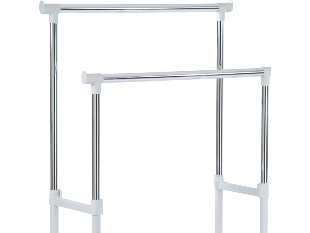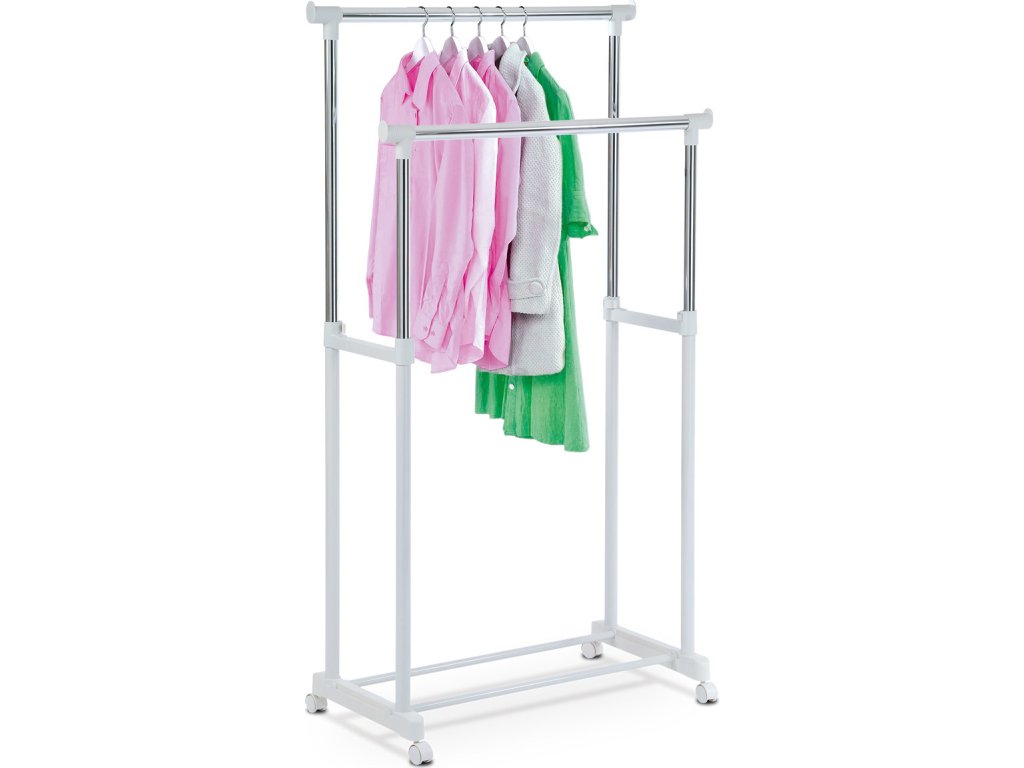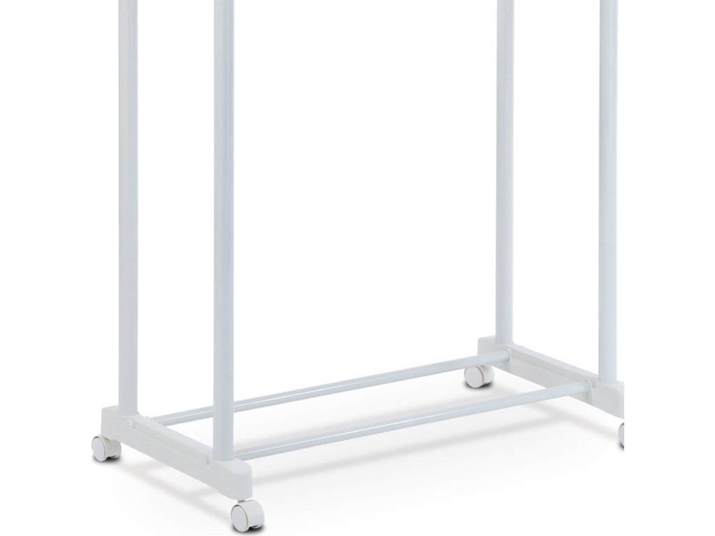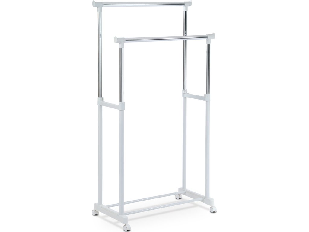 Dvojramenný stojan na šaty v bílé barvě kombinuje pevné kovové tyče s odolnými plastovými prvky a chromovanými detaily, což zajišťuje stabilitu a dlouhou životnost. Výškově nastavitelná konstrukce umožňuje přizpůsobit délku ramínek podle potřeby, což usnadňuje zavěšení různých typů oděvů. Praktický odkladač pod spodní tyčí nabízí prostor pro uložení bot nebo dalších doplňků. Stojan je vybaven čtyřmi kolečky pro snadnou manipulaci a přemístění v interiéru. Kompaktní rozměry a jednoduchý design umožňují jeho využití v domácnostech i komerčních prostorách.