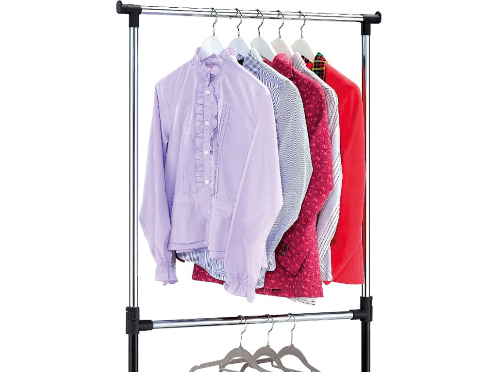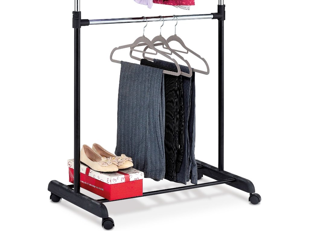 Dvojramenný stojan na šaty v černém provedení kombinuje kovové a plastové části s chromovanými prvky, které zajišťují stabilitu a moderní vzhled. Horní tyč je určena pro zavěšení košil, bund či šatů, zatímco spodní tyč nabízí prostor pro zavěšení kalhot nebo sukní. Pevná základna je vybavena kolečky pro snadnou manipulaci a přemístění v interiéru. Praktický odkladač ve spodní části umožňuje uložení bot nebo krabic, což přispívá k lepší organizaci prostoru. Stojan je navržen tak, aby poskytoval dostatek místa pro oděvy a zároveň byl stabilní a snadno přemístitelný.