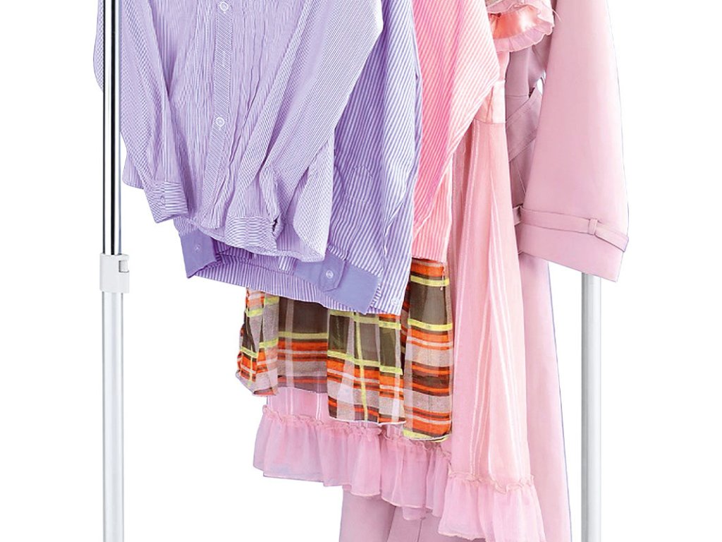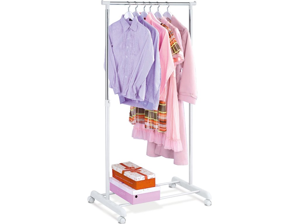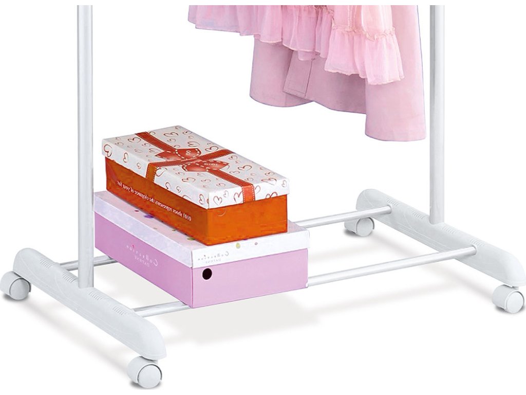 Jednoramenný stojan na šaty v bílé barvě kombinuje pevný kovový rám s praktickými plastovými prvky a chromovanou tyčí pro zavěšení oděvů. Výška stojanu je nastavitelná, což umožňuje přizpůsobení různým délkám oblečení a usnadňuje jeho organizaci. Spodní odkladač poskytuje prostor pro uložení krabic nebo dalších doplňků, čímž zvyšuje funkčnost a využití prostoru. Stabilní podstava na kolečkách umožňuje snadnou manipulaci a přesun v interiéru. Díky kvalitnímu zpracování a kombinaci materiálů je stojan vhodný pro domácí i komerční použití.