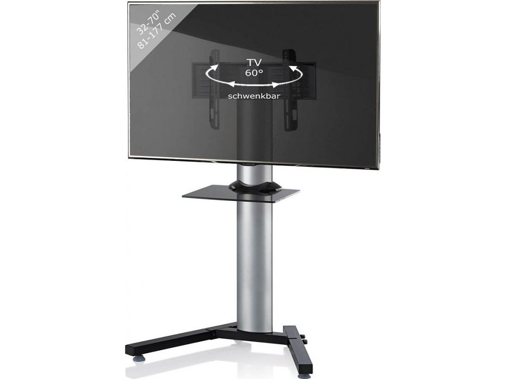 Tento stabilní TV stojan je vyroben z vysoce kvalitního hliníku. Je vhodný pro všechny ploché obrazovky (LCD / plazma / LED) o uhlopříčce 81 až 177 cm (32" - 70"). Samozřejmostí je skryté vedení kabelů. K dispozici police z černého bezpečnostního tvrzeného skla.