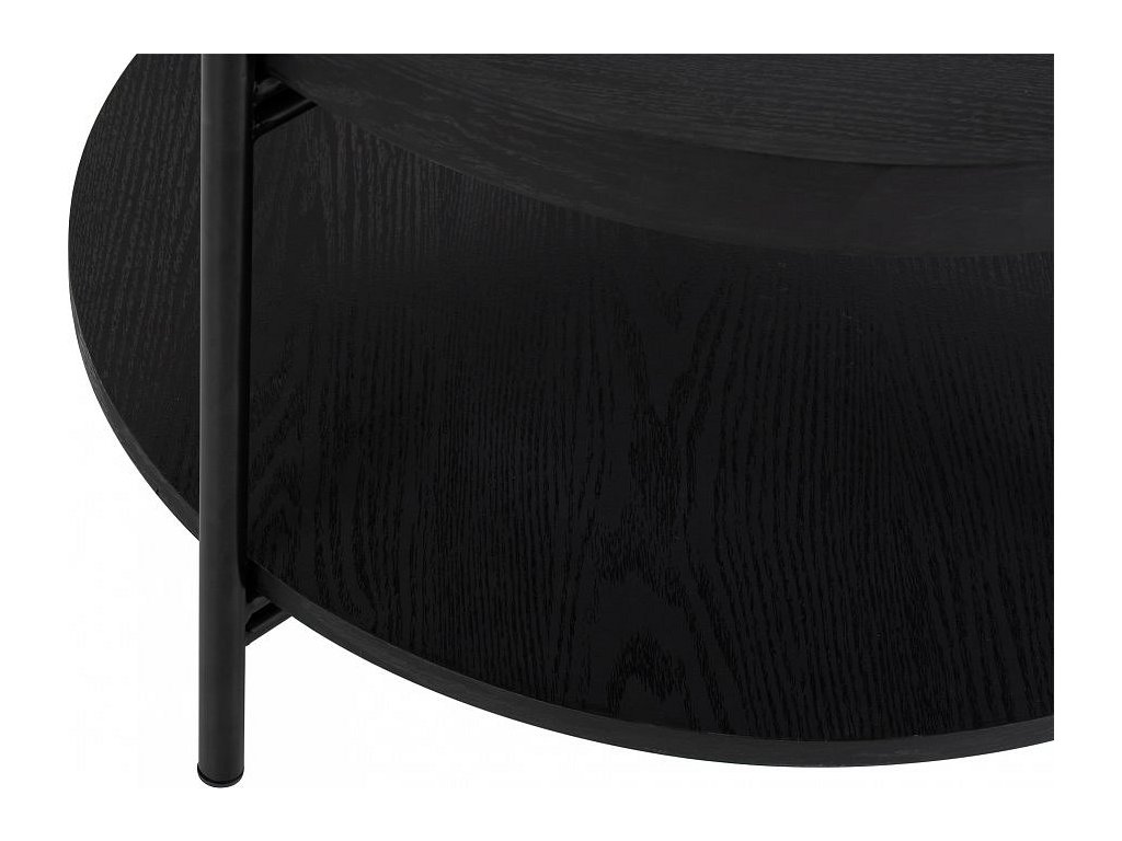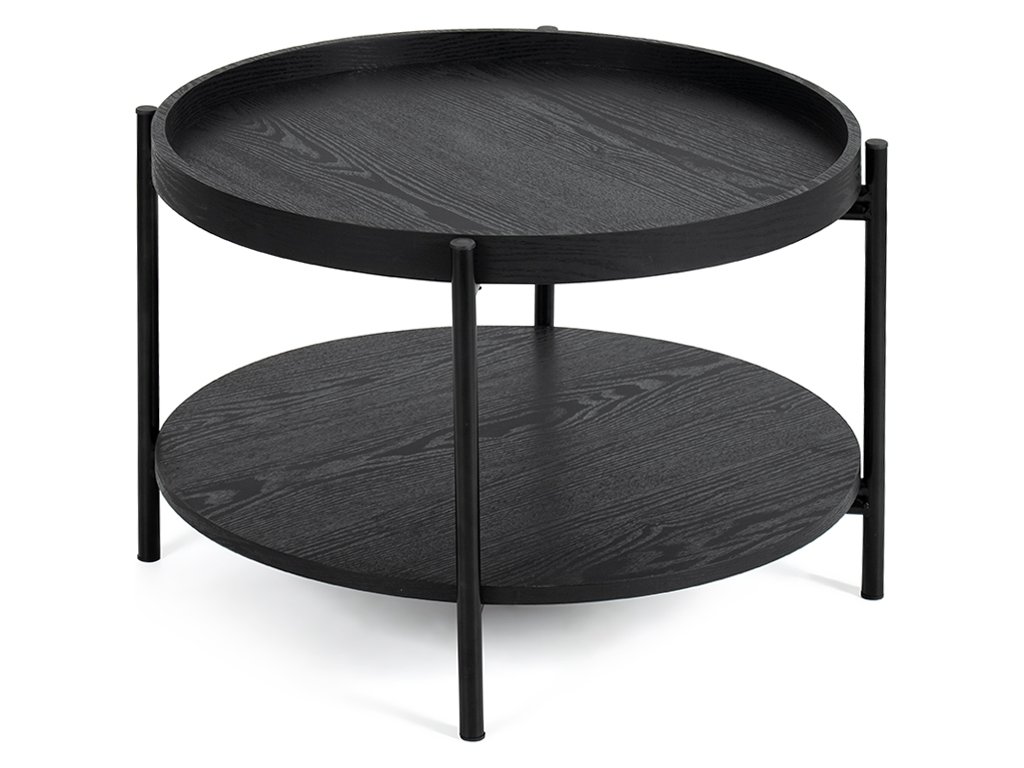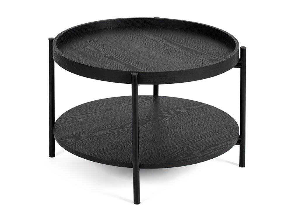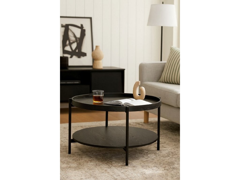 Kulatý konferenční stolek s moderním minimalistickým designem. Dvě odkládací plochy v černém dekoru dřeva pro maximální praktičnost. Stabilní kovová konstrukce v černém provedení. Vhodný do obývacího pokoje či stylové pracovny. Spojuje eleganci, funkčnost a nadčasový vzhled.
