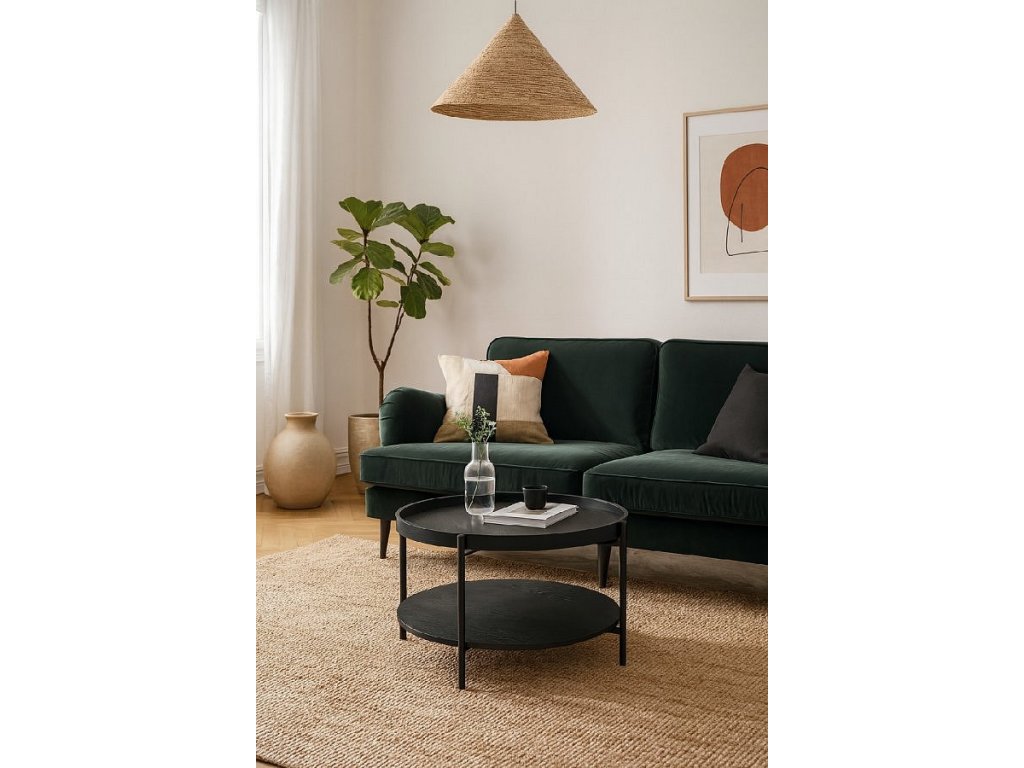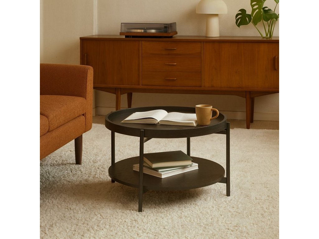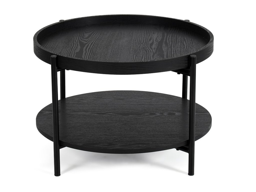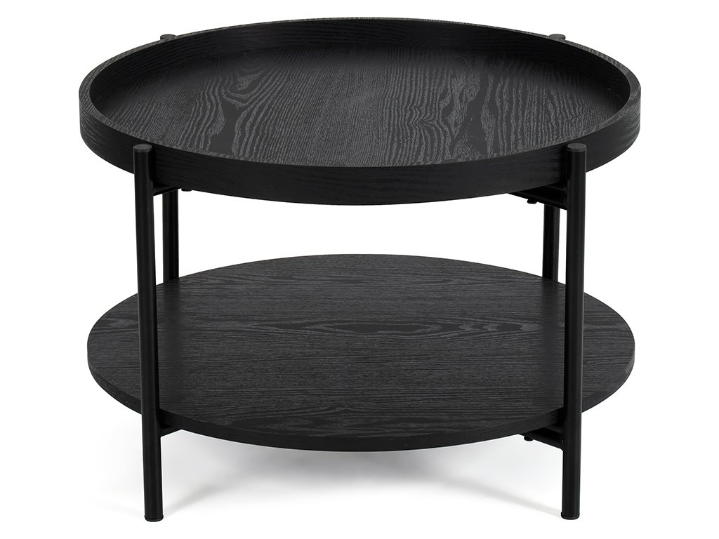 Kulatý konferenční stolek s moderním minimalistickým designem. Dvě odkládací plochy v černém dekoru dřeva pro maximální praktičnost. Stabilní kovová konstrukce v černém provedení. Vhodný do obývacího pokoje či stylové pracovny. Spojuje eleganci, funkčnost a nadčasový vzhled.