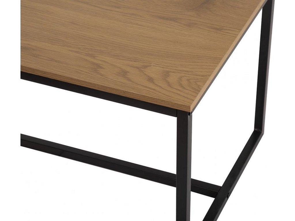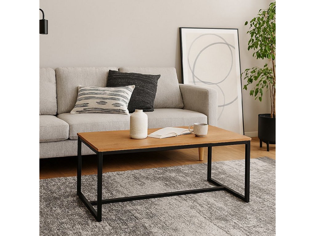 Moderní konferenční stolek s jednoduchým designem. Stolová deska v dekoru přírodního dřeva dodává interiéru hřejivý vzhled. Stabilní kovová konstrukce v černém provedení. Ideální do obývacího pokoje či pracovny. Spojuje praktičnost, odolnost a nadčasový styl.