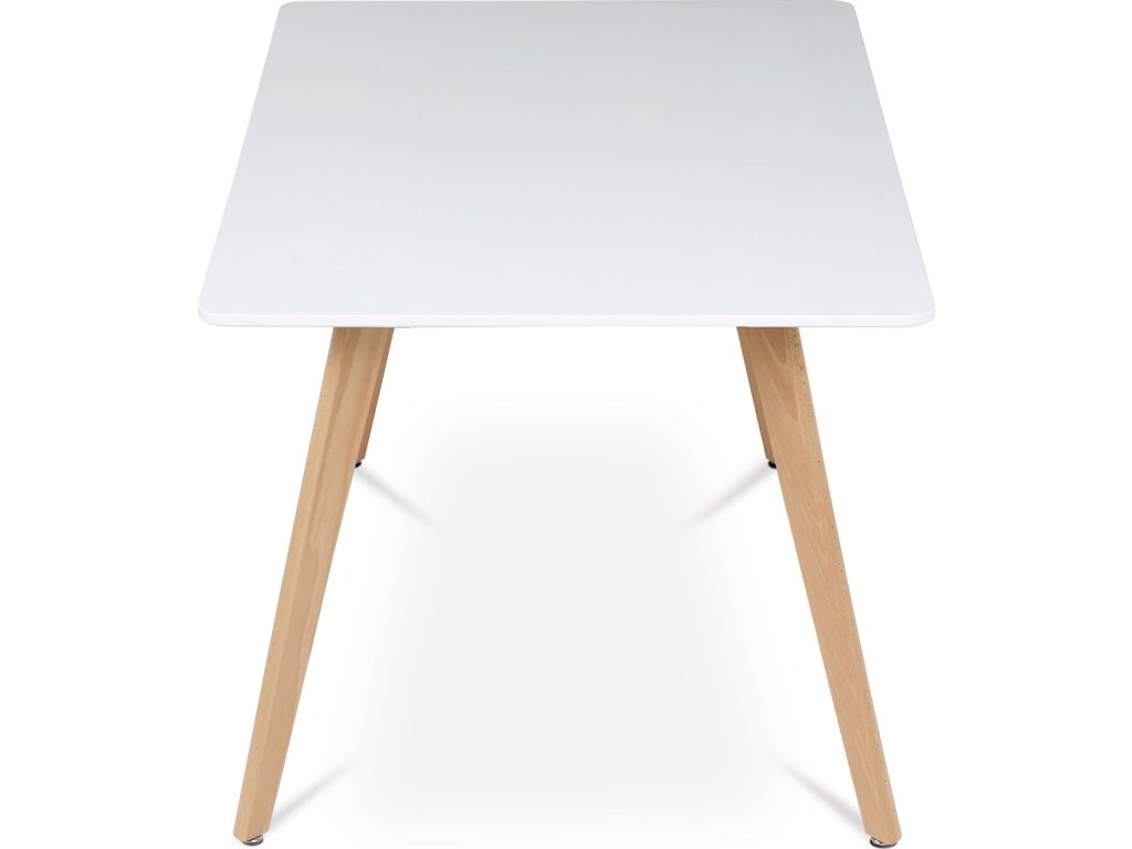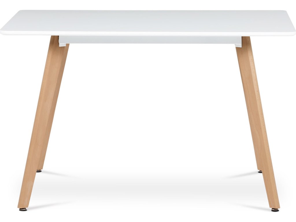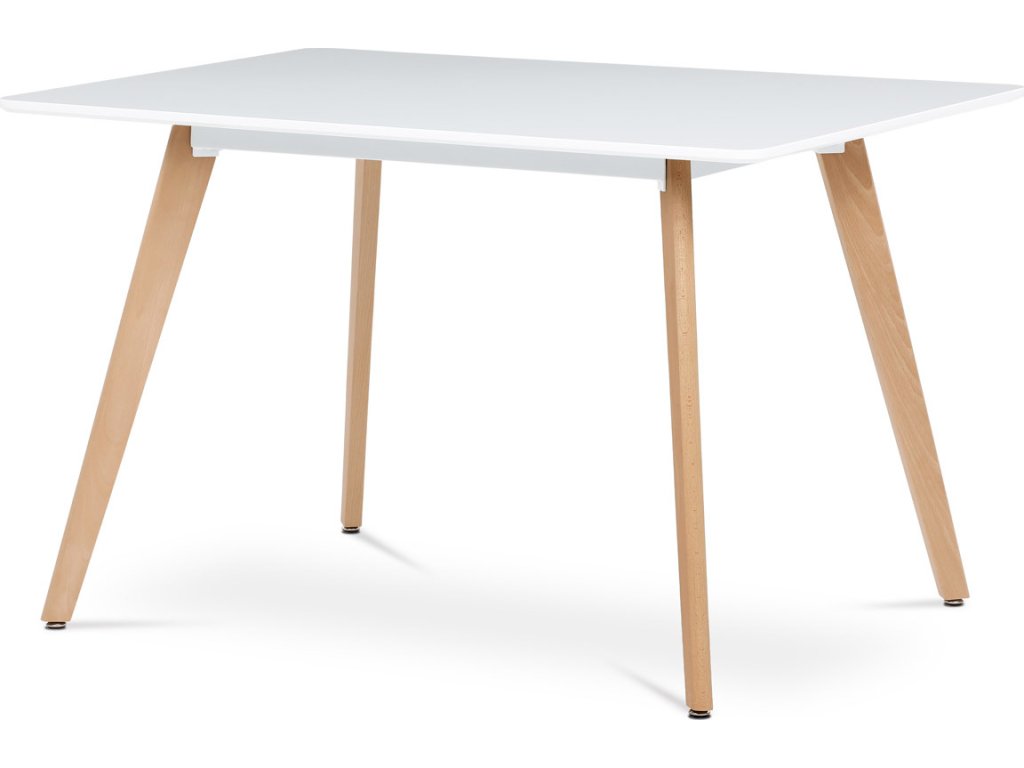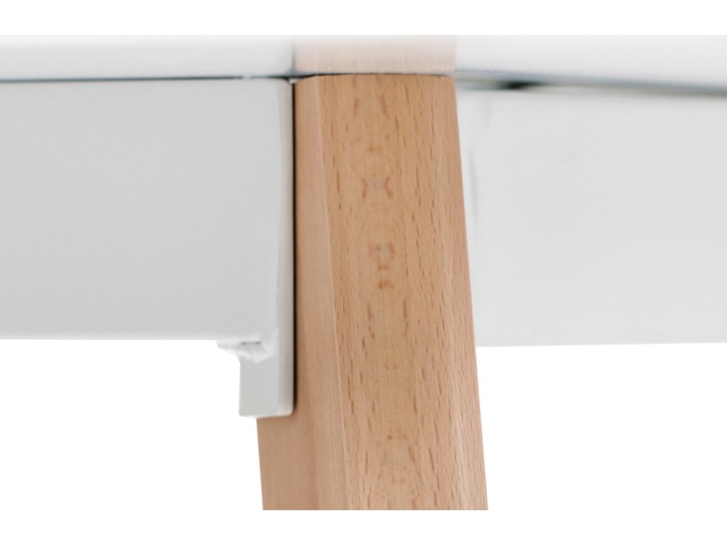 Jídelní stůl o rozměrech 120x80x74 cm kombinuje pevnou desku z MDF s matnou bílou povrchovou úpravou a nohy z masivního buku, které dodávají stabilitu a přírodní vzhled. Deska stolu je navržena s jemně zaoblenými rohy pro bezpečnost a pohodlí při používání. Masivní bukové nohy jsou vybaveny rektifikačními patkami, které umožňují vyrovnání nerovností podlahy a zajišťují stabilitu stolu. Matný lak na desce usnadňuje údržbu a odolává běžnému opotřebení. Stůl je pevný a vhodný pro každodenní použití v jídelnách i kuchyních.