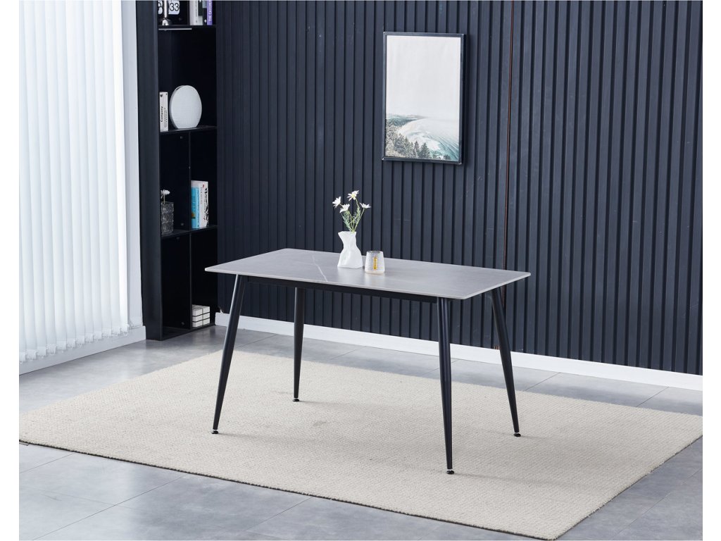 Jídelní stůl s rozměry 130x70x76 cm nabízí desku z kvalitní slinuté keramiky v imitaci matného šedého mramoru, která je odolná vůči poškrábání a snadno se udržuje. Černé kovové nohy s mírně zkoseným tvarem zajišťují stabilitu a pevnost celé konstrukce, přičemž jejich povrchová úprava zabraňuje korozi. Zaoblené rohy desky přispívají k bezpečnosti a zároveň dodávají moderní vzhled. Stůl je vhodný pro každodenní použití v jídelnách i kuchyních, kde oceníte kombinaci praktičnosti a stylového designu. Díky pevnému materiálu a kvalitnímu zpracování je navržen pro dlouhou životnost.