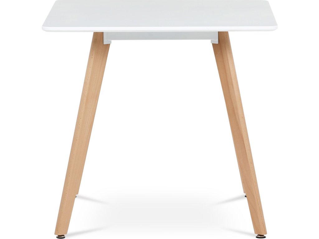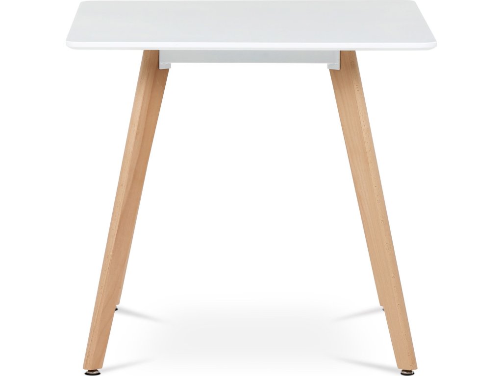 Jídelní stůl o rozměrech 80x80x74 cm kombinuje pevnou desku z MDF s matnou bílou povrchovou úpravou a stabilní nohy z masivního buku. Zaoblené rohy desky přispívají k bezpečnosti a zároveň dodávají moderní vzhled. Stůl je vybaven rektifikačními nohami, které umožňují vyrovnání nerovností podlahy a zajišťují stabilitu během používání. Matný lak na desce usnadňuje údržbu a odolává běžnému opotřebení. Díky kvalitnímu zpracování a použitým materiálům je vhodný pro každodenní použití v jídelnách i kuchyních.