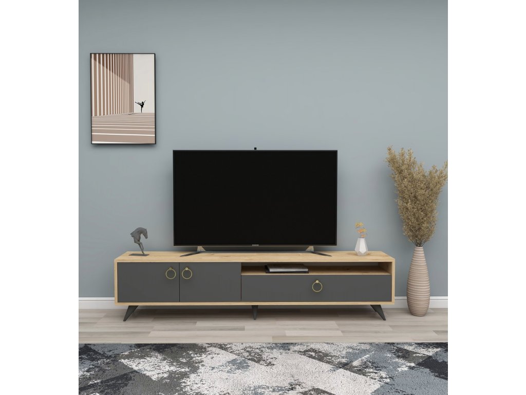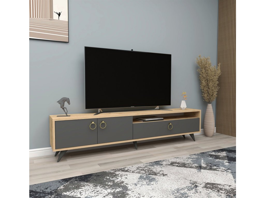 TV stolek přináší do vašeho obývacího pokoje styl, praktičnost a dostatek úložného prostoru. Díky širokému vzhledu, třem plným dvířkům a regálku nabízí ideální řešení pro uložení elektroniky, příslušenství nebo dekorací. Kvalitní zpracování a moderní design zaručují, že stolek bude ozdobou každého interiéru.