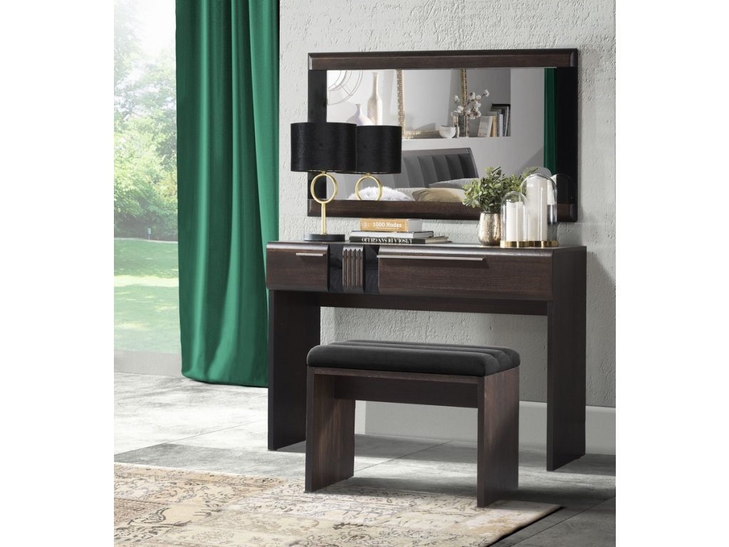 CASA 75024 Taburet k toaletnímu stolku ze sektorové řady PORTI značkového výrobce Szynaka. Systém PORTI je exkluzivní kolekce navržena v moderním duchu. Struktura ušlechtilého masivního dubu na přední straně a přírodní dýha na korpusu zdůrazňuje velmi klasickou barvu čokoládový dub. Opakující se prvek riflování v kombinaci s černým sklem je dekorační motiv, který se odráží v každém bloku. Celá řada se vyznačuje elegancí a jednoduchými tvary, které zaručují plné využití prostoru. Barevné provedení - antický dub. Sedák je potažen kvalitní látkou imitující kůži se snadnou údržbou čistění - barva černá Carabu 33.
