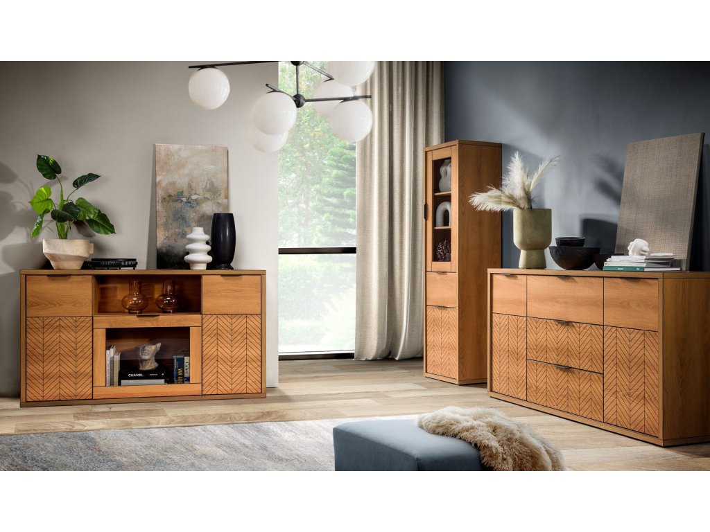 Sektor je ve stylu moderní elegance. Charakteristickým znakem nábytku je jeho stylové a elegantní zdobení na přední části.