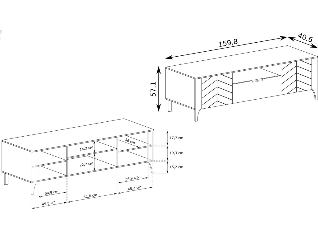 Díky dvoum skříňkám s vnitřními policemi, jednou zásuvkou a volným prostorem budete mít ve věcech konečně pořádek. Kvalitní výsuvy (soft close) a panty s tichým dovíráním se postarají o každodenní komfort. Rozměry viz obrázek.