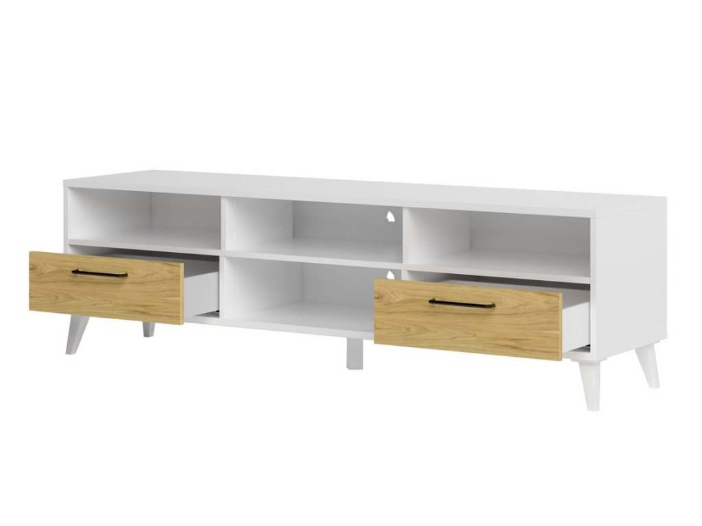 CASA 75095 Televizní stolek se 2 zásuvkami. Korpus je vyroben z kvalitní desky LTD v barvě bílá mat, dvířka jsou vyrobeny z desky MDF v barvě bílá mat, čela zásuvek jsou v barvě ořech americký světlý. Úchyty jsou kovové v černé barvě zakončené zlatými prvky, nožky jsou plastové bílé. Dodáváme v demontovaném stavu.