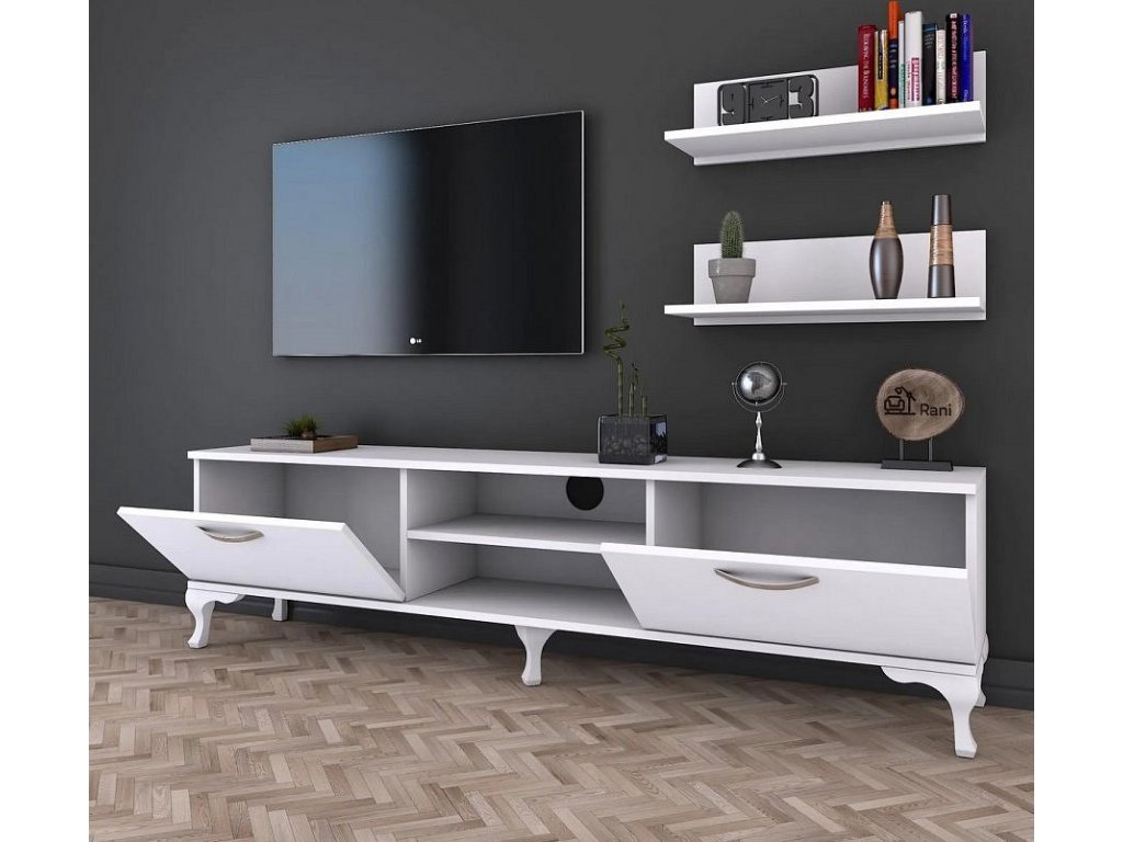 Materiál: Melamin, VT laminát a další kvalitní materiály. Barva: bílá. Sestava obsahuje - TV stolek (150 x 30 x 43,7 cm), 2 závěsné police (50 x 13 x 15 cm). Tloušťka materiálu: 18 mm. Díky tomu je tato obývací stěna odolná a dlouhodobě udržitelná. Dodáváme v demontovaném stavu.