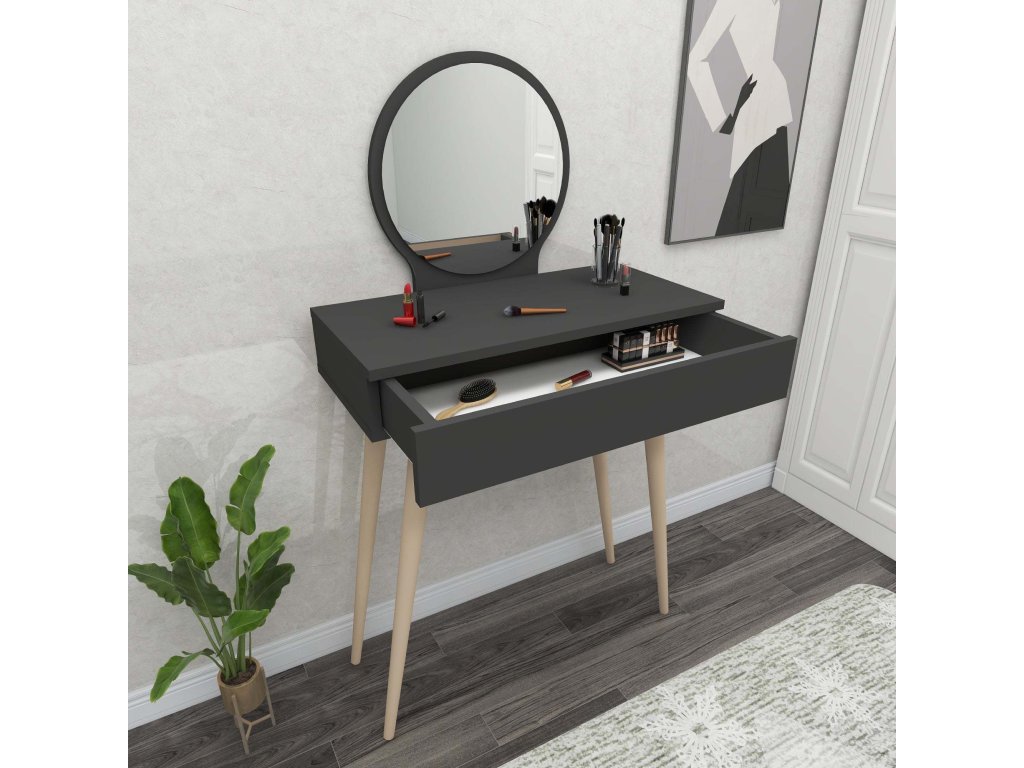 Toaletní stolek spojuje moderní design s praktičností, což z něj činí ideální volbu pro každou ložnici. Tento vysoký stolek je vybaven zásuvkou a integrovaným zrcadlem, které usnadní každodenní péči a organizaci kosmetiky. Díky kvalitním materiálům a dřevěným nohám je nejen funkční, ale také stylový.