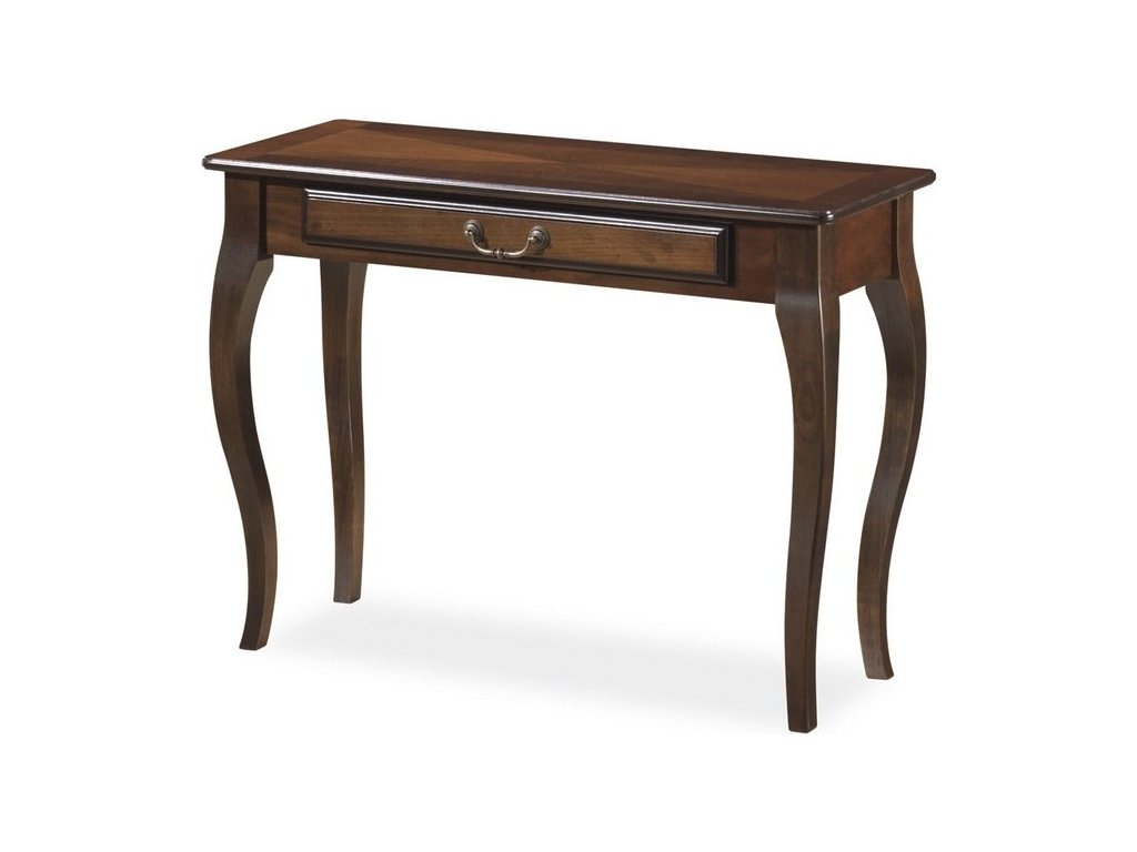 CASA 11645 Elegantní konzolový stolek z kolekce PADOVA v rustikálním stylu. Zajímavý vzhled stolku vyzdvihují jemné tvary a ozdobný vzorek s dvojbarevným odstínem. Deska stolku je vyrobena z kvalitní MDF v kombinaci s přírodní dýhou, nohy stolku jsou ze dřeva. Stolek je v barvě tmavý ořech. Praktická zásuvka na drobnosti. Rozměry - 104 x 40 x 75 cm.