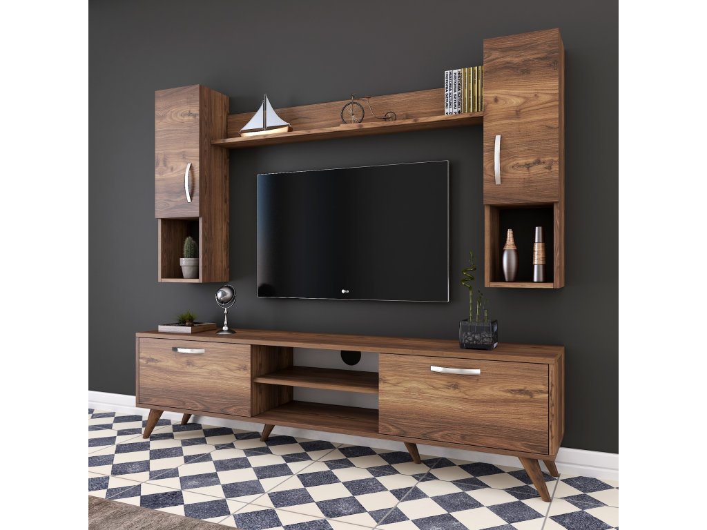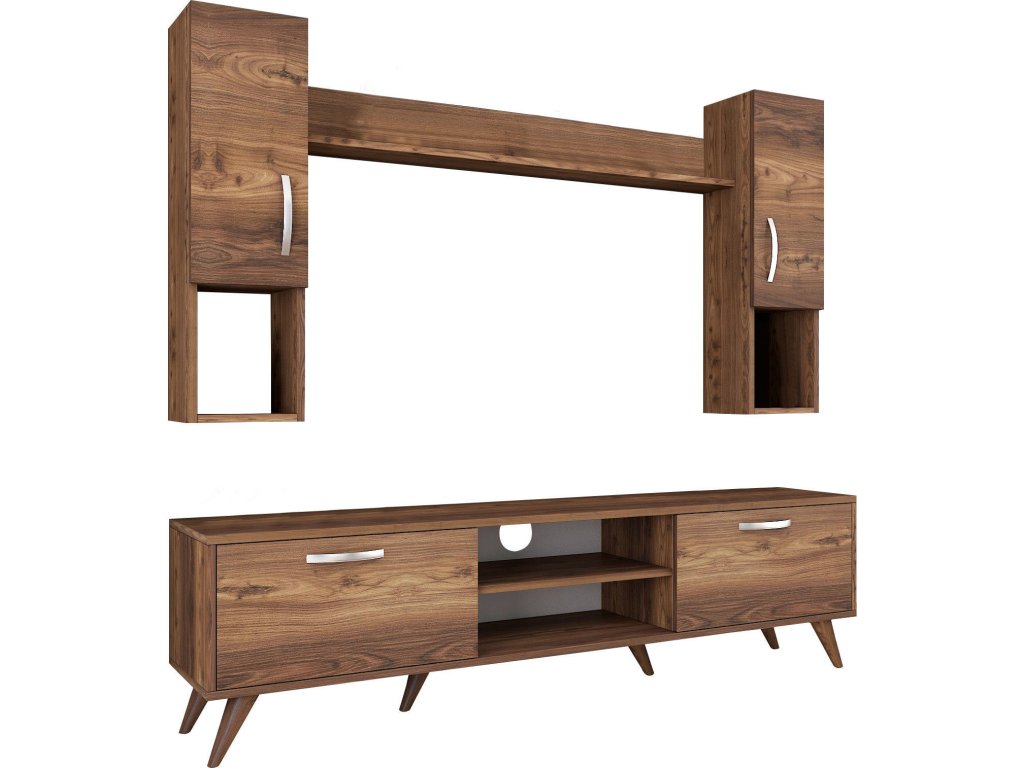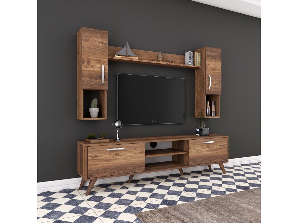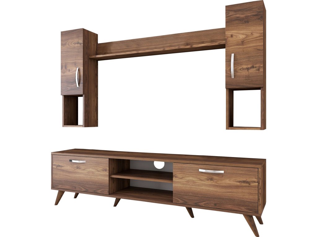 Obývací stěna je skvělým doplňkem pro váš obývací pokoj. Díky elegantnímu designu v dekoru ořechu a praktickému uspořádání nabízí perfektní kombinaci stylu a úložného prostoru. Tato stěna přináší do vašeho interiéru harmonii a moderní vzhled.