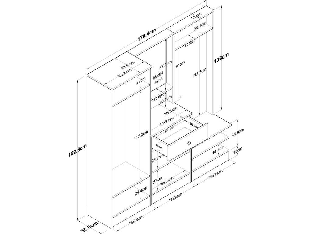 - Rozměry: 182,8 x 179,4 x 37,3 cm – prostorná sestava pro organizaci každé předsíně.