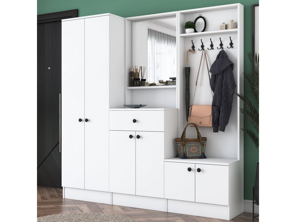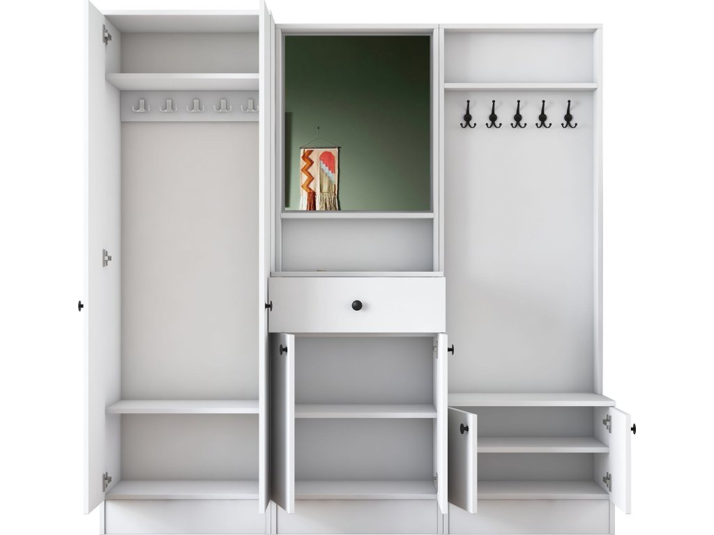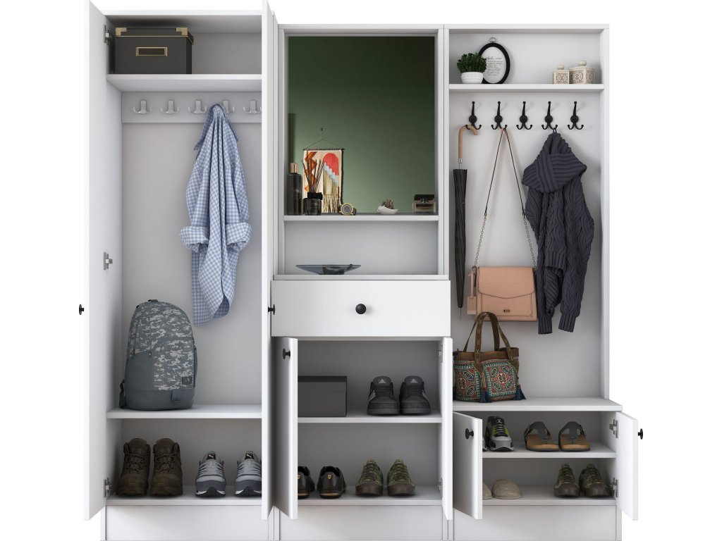 Předsíňová sestava je ideální volbou pro každou moderní předsíň. Díky čistě bílému provedení dodává prostoru svěží a elegantní vzhled. S promyšleným uspořádáním a dostatkem úložného prostoru pomáhá udržovat předsíň přehlednou a organizovanou.