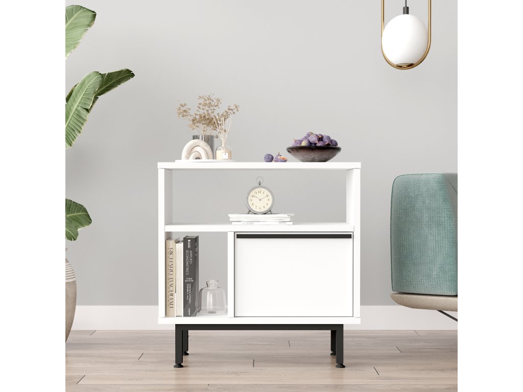 Odkládací stolek je perfektním doplňkem do moderního obývacího pokoje. Spojení kvalitního LTD materiálu a kovu zaručuje dlouhou životnost a atraktivní vzhled. Díky kompaktním rozměrům, plnému dvířku a regálku nabízí stolek praktický úložný prostor a snadné začlenění do interiéru. Obdélníkový tvar zajišťuje univerzálnost a estetiku.