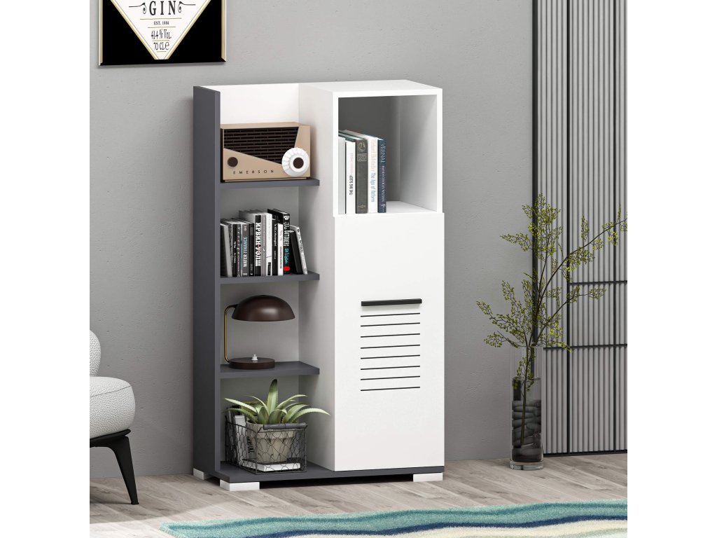 Skříňka je perfektní volbou pro ty, kteří hledají praktické a estetické úložné řešení do obývacího pokoje. Její vysoký design a kombinace skříňky a regálku poskytují dostatek prostoru pro uspořádání knih, dekorací nebo dalších potřebných věcí.
