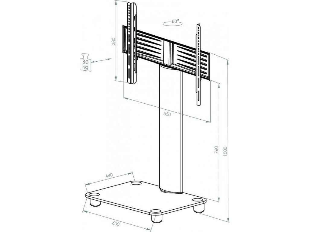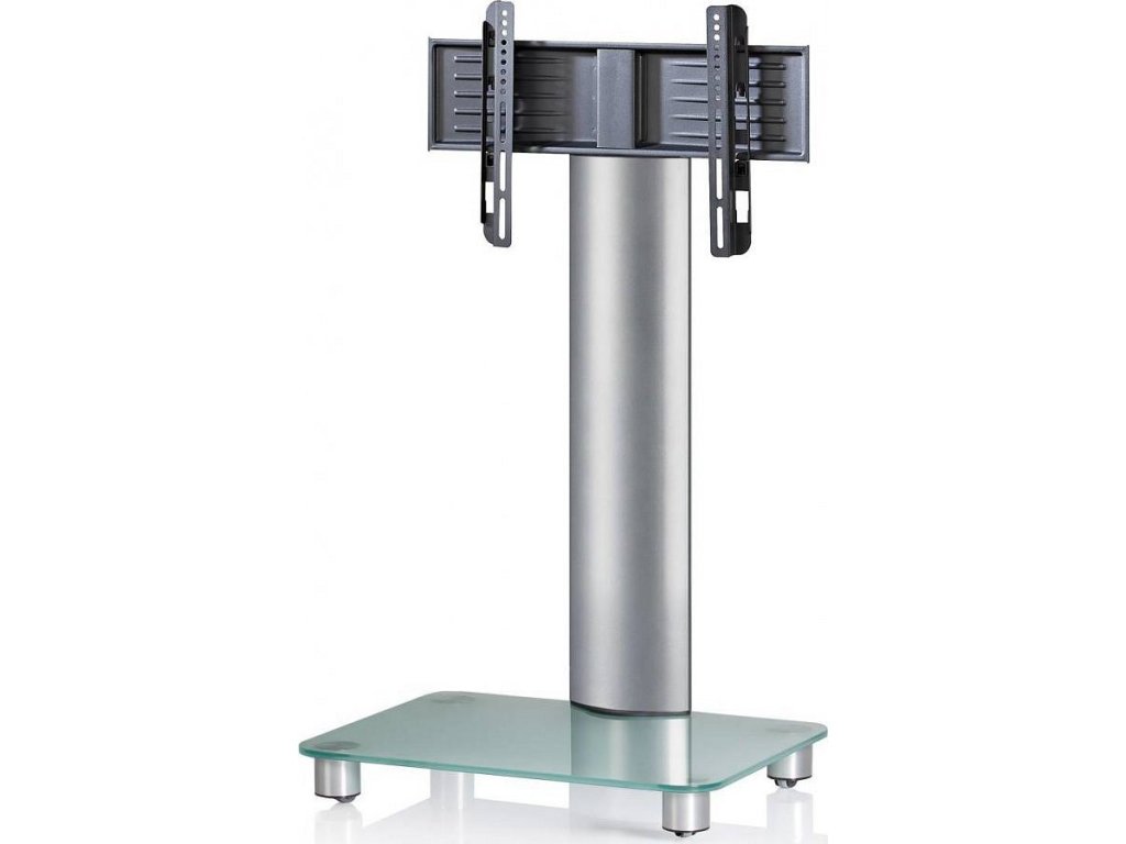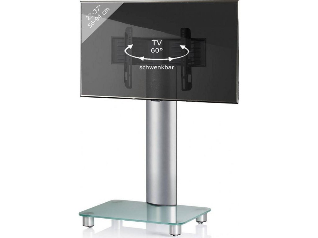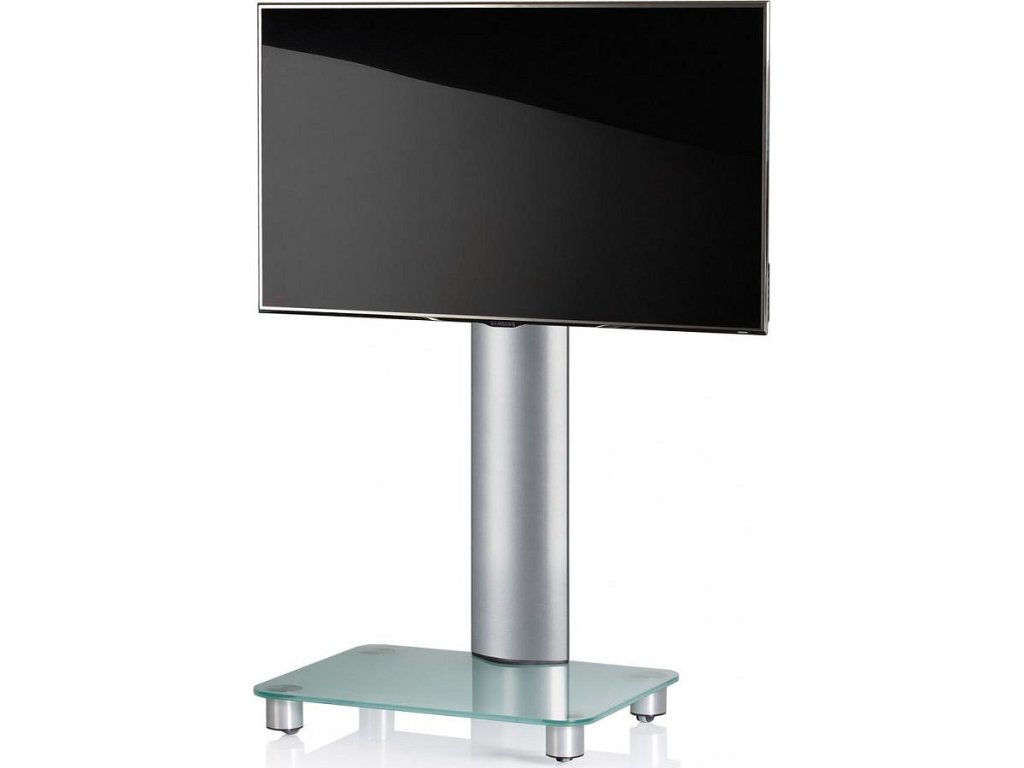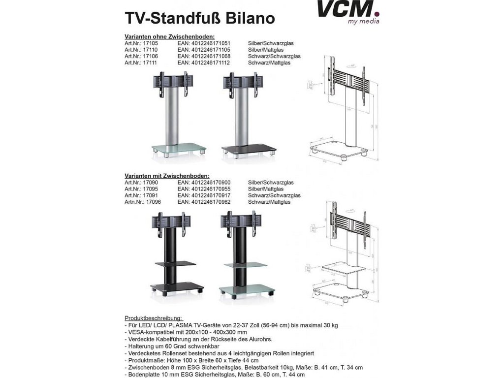 TV stolek VCM „Bilano“ – kartáčovaná hliníková trubka. – Včetně držáku pro většinu plochých LED / LCD / plazmových obrazovek do úhlopříčky 37 palců (94 cm) s maximální hmotností 30 kg. – Funkce otáčení: rozsah otáčení 60°. – VESA 200x100, 200x200, 200x300, 300x200, 300x300, 400x200 a 400x300 mm. – Skleněná podlahová deska z 10mm bezpečnostního skla vyztuženého ESG. – Kabelový kanál na zadní straně hliníkové trubky. – Včetně sady koleček s hladkým chodem. – Dodáváno v demontovaném stavu včetně montážního návodu a montážního materiálu. – Hliníkový sloupek. – Rozměry: V 100 x Š 60 x H 44 cm.