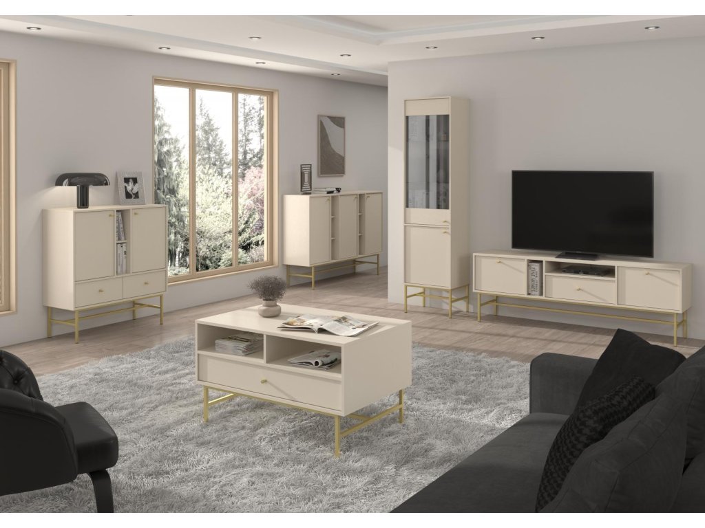 Série Tomila nabízí noční, TV i konferenční stolky, vitríny a komody v široké škále tvarů, barev a typů noh.