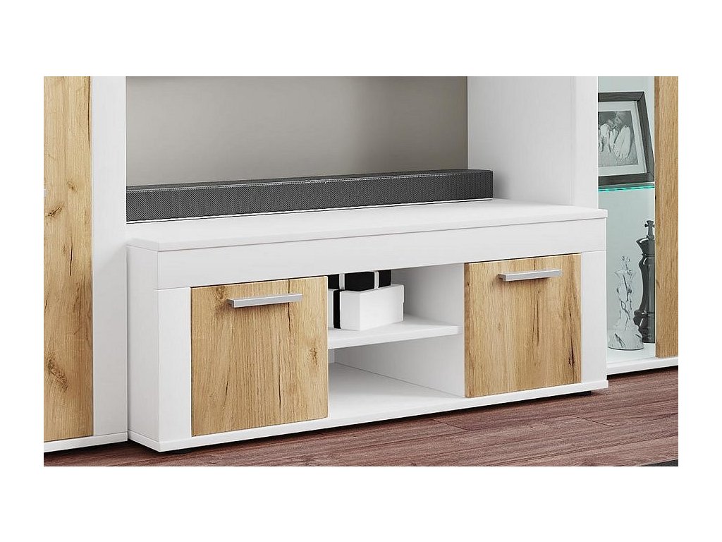 Stolek pod TV je vybaven dvěma výklopnými dvířky pro skrytý úložný prostor a dvěma otevřenými přihrádkami vhodnými pro audio zařízení, herní konzole nebo dekorace. Celkem čtyři přihrádky poskytují dostatek místa pro uspořádání kabelů, příslušenství i dalších předmětů.