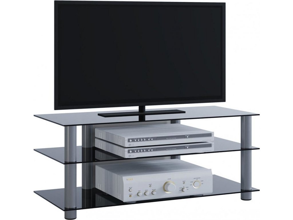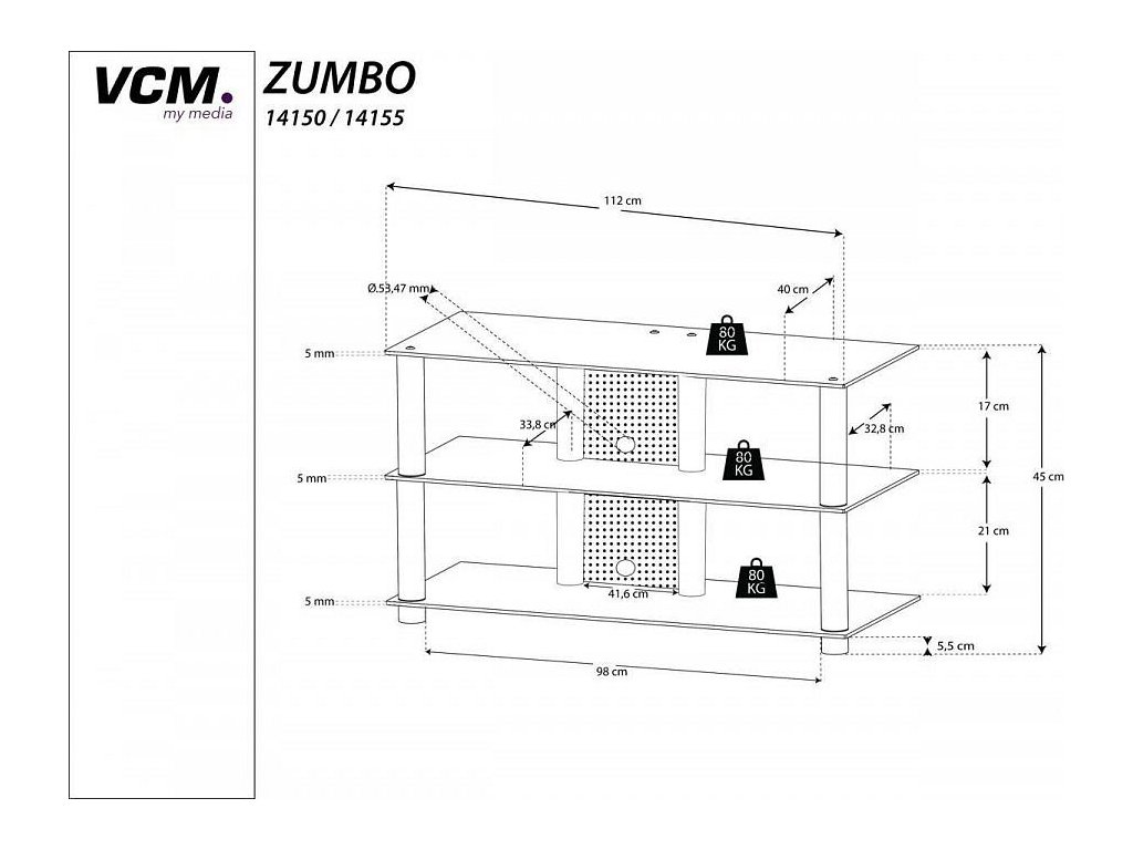VCM TV stojan „Zumbo“. - Hliníkové sloupky v elegantním designu. - Se 3 robustními policemi vyrobenými z 6mm bezpečnostního skla ESG. - Všechny skleněné police mají nosnost až 80 kg. - Vzdálenost mezi policemi: dole 21 cm, nad 17 cm. - Skrytá správa kabelů. - V demontovaném stavu včetně montážního návodu a montážního materiálu. - Rozměry: Š. 110 x H. 42 x V. 45 cm. - Příslušenství: Sada koleček 14270 Rolio