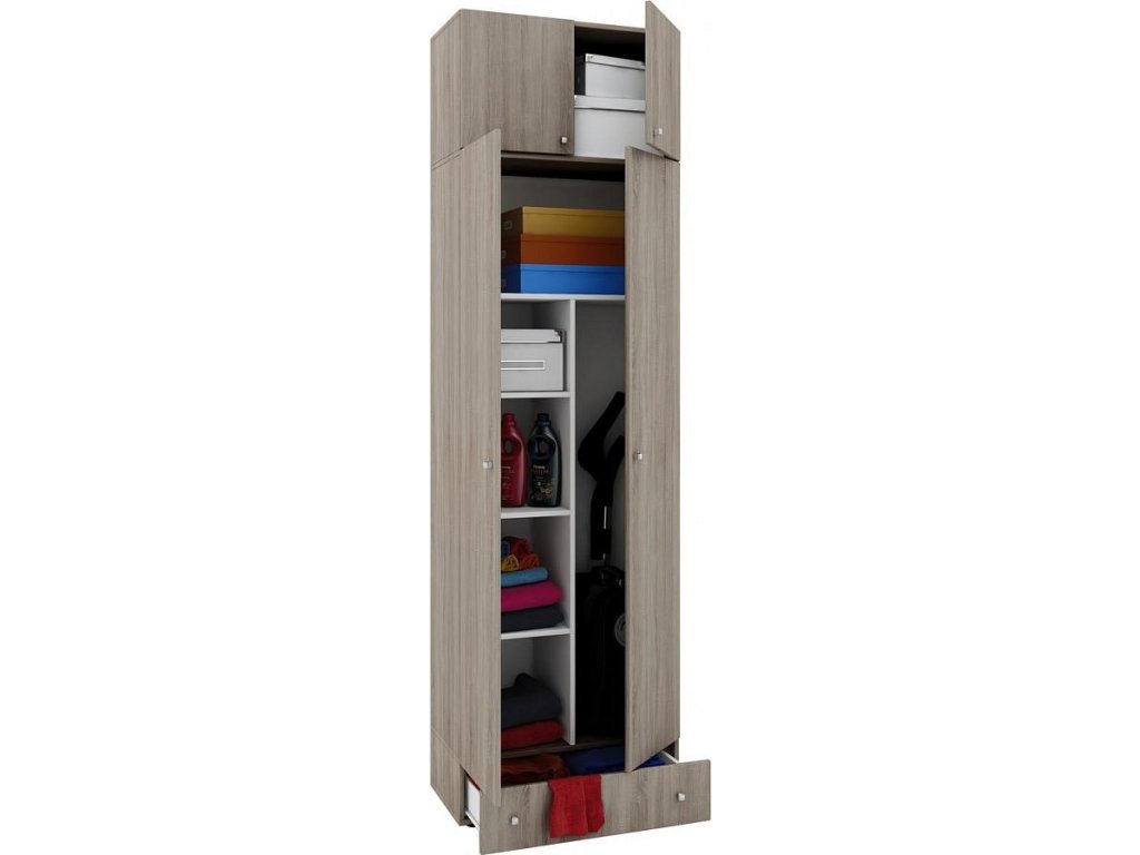 Sada sestávající z víceúčelové skříňky včetně vhodného horního nástavce a zásuvky - Individuálně nastavitelná skříňka - Pro optimální úložný prostor - Ideální jako skříňka na úklid nebo košťata - Praktické rozdělení do 6 prostorných přihrádek + další přihrádka jako horní nástavec a další zásuvka - Dvoje snadno otevíratelné dveře (skříňka a horní nástavec) - Lehce vyjíždějící zásuvka se dvěma úchyty - Rozšiřitelná v rámci série "Vandol" od VCM - Rozměry: V. 238 x Š. 70 x H. 40 cm