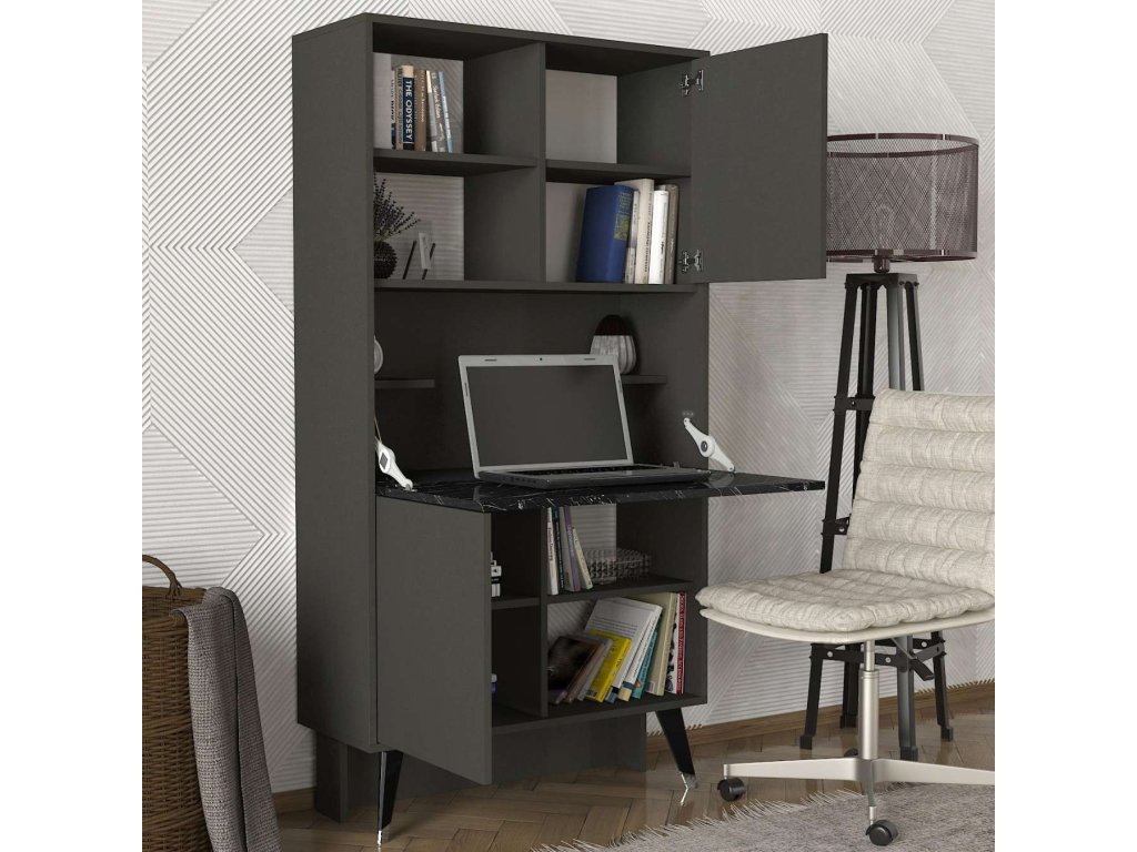 Regál vyniká svým moderním a praktickým designem, který se skvěle hodí do jakéhokoliv interiéru. Dvě pevné police, dvě skříňky a výklopná skříňka, která může sloužit jako stolek na notebook, poskytují dostatek úložného prostoru pro knihy, dekorace či kancelářské potřeby. Kombinace antracitové a černého mramoru dodává regálu elegantní vzhled. Robustní LTD materiál o tloušťce 18 mm zajišťuje dlouhou životnost a stabilitu tohoto regálu.