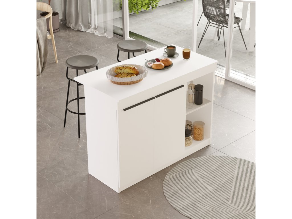 nabízí praktické řešení pro vaši kuchyni. Pracovní plocha umožňuje pohodlnou přípravu pokrmů, zatímco úložný prostor za dvěma dvířky a otevřený regálek poskytují dostatek místa pro uskladnění kuchyňského náčiní, koření nebo jiných doplňků. Kompaktní rozměry a elegantní design zajišťují, že se ostrůvek hodí i do menších prostor.