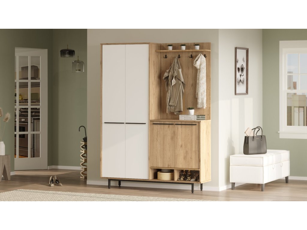 kombinuje funkčnost a moderní design. Věšáková stěna poskytuje prostor pro zavěšení kabátů a tašek, policová skříň zajistí místo pro obuv, doplňky nebo sezónní vybavení, a botník nabízí organizované uskladnění bot. Sestava nejen optimalizuje využití prostoru, ale zároveň dodává vaší předsíni elegantní a čistý vzhled.