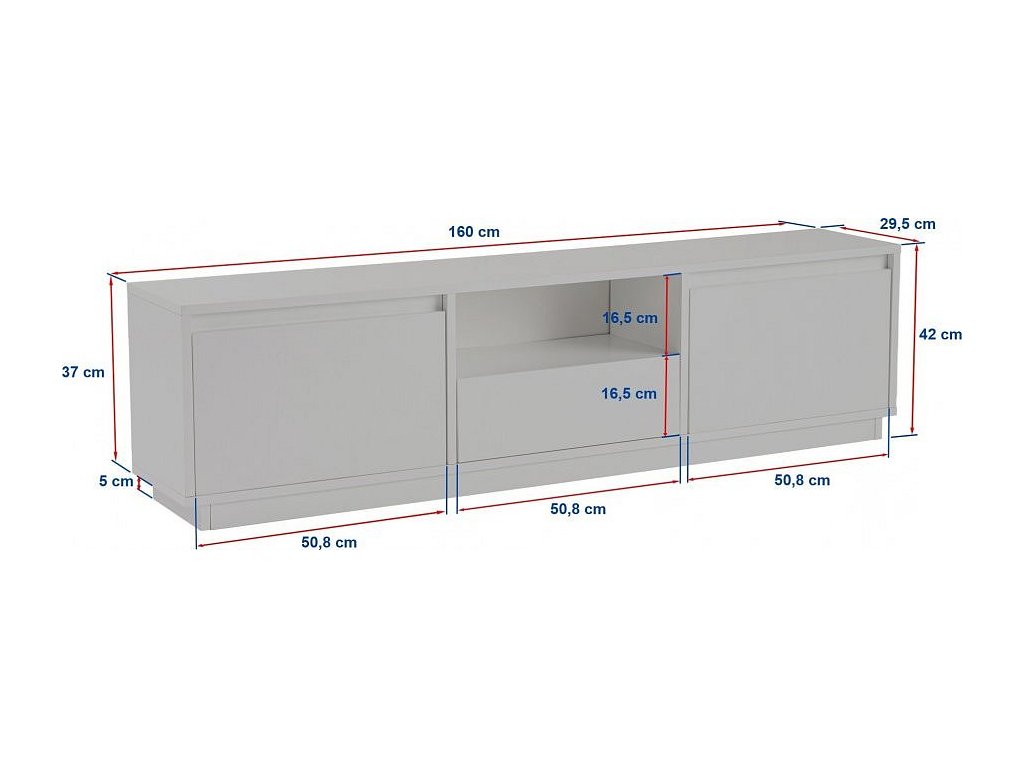 S šířkou 160 cm, výškou 42 cm a hloubkou 29,5 cm má tento televizní stolek ideální velikost pro většinu obývacích pokojů. Poskytuje dostatek prostoru pro vaši televizi, přehrávače médií a další zábavní potřeby, takže vše budete mít uspořádané a na dosah ruky.