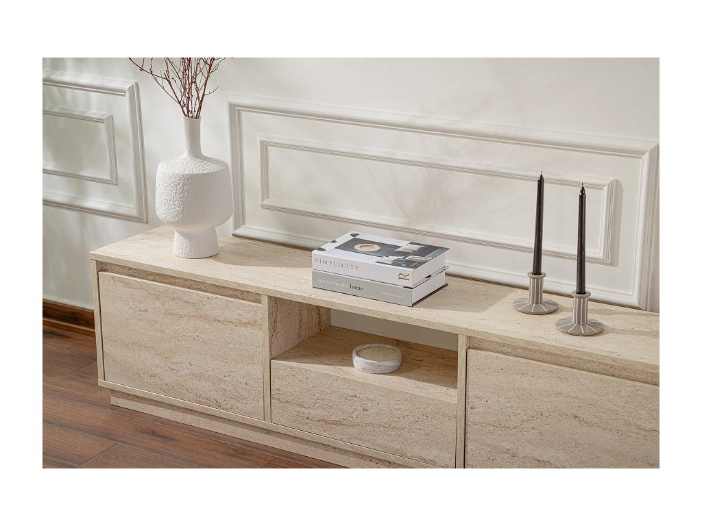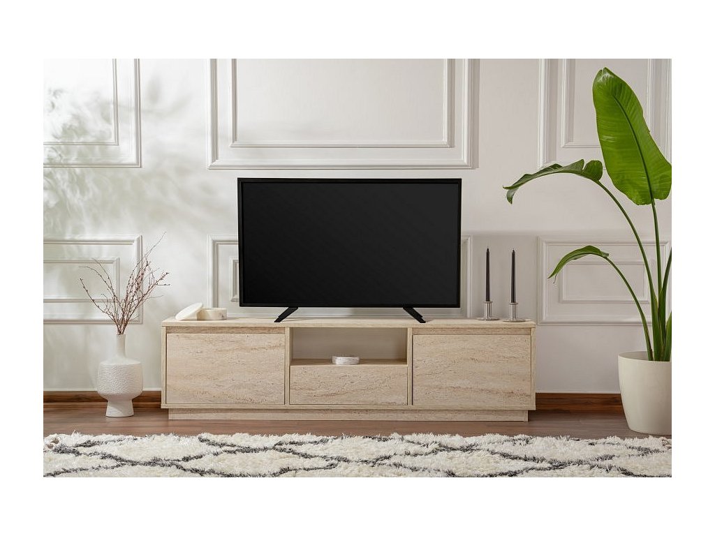 Rozlučte se s nepořádkem a přivítejte elegantní a moderní televizní stolek, který okamžitě pozvedne vzhled vašeho obývacího pokoje. Travertinová barva dodává nádech luxusu, díky čemuž je perfektním doplňkem jakéhokoli stylu bytového zařízení.