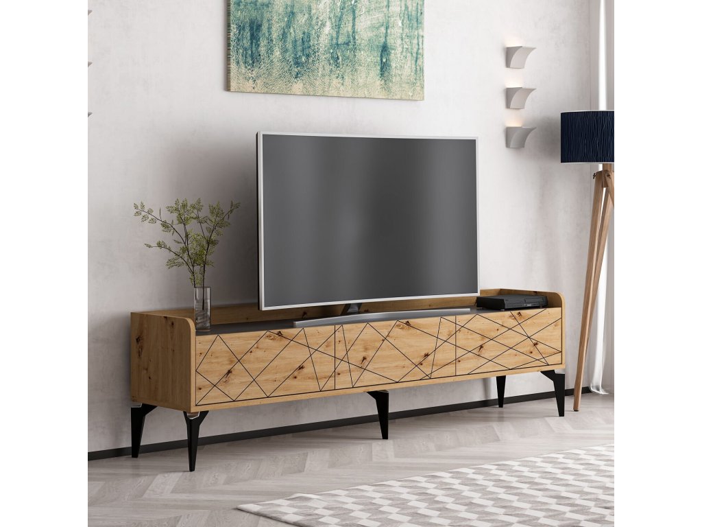 TV stolek přináší elegantní kombinaci dubu Artisan a antracitu, která dodá vašemu obývacímu pokoji moderní a stylový vzhled. Díky třem plným dvířkům poskytuje dostatek úložného prostoru pro multimediální zařízení, kabely a další nezbytnosti.