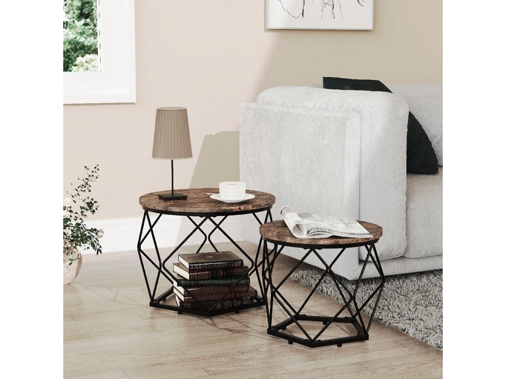Hlavní vlastnosti: - Speciální kus nábytku do ložnice nebo obývacího pokoje - Stylový kovový rám s úložným prostorem šetřícím místo - Design v industriálním stylu - Rozměry stolu cca v. 40 x š. 50 x h. 50 cm a v. 36 x š. 40 x h. 40 cm S odkládacími stolky „Helaro“ designér vytvořil nábytek, který může být poutavým prvkem v každé místnosti. Praktický, přímočarý a přesto elegantní. Industriální vzhled černého železného rámu je doplněn rustikálním dřevem a vytváří tak harmonickou směs stylů. Skvělý odkládací stolek nebo noční stolek s úložným prostorem, který nabízí mnoho praktických využití. Od 70. let 20. století se VCM specializuje na design, výrobu a distribuci nábytku s férovým poměrem cena/výkon a již zkrášlil miliony domácností.