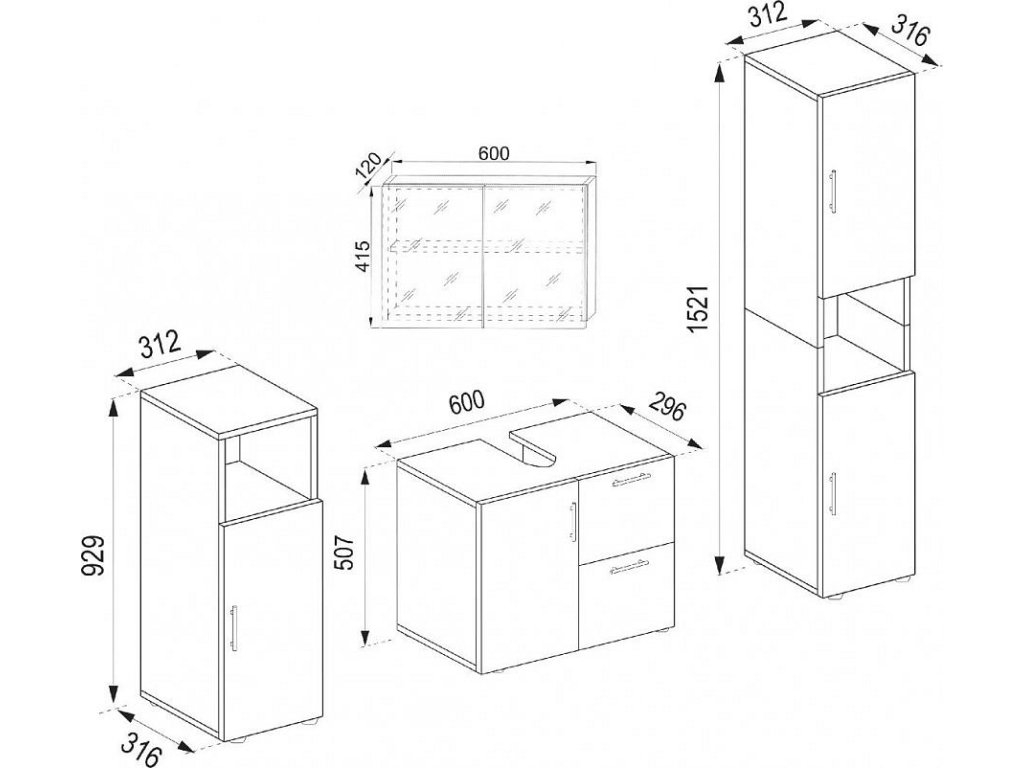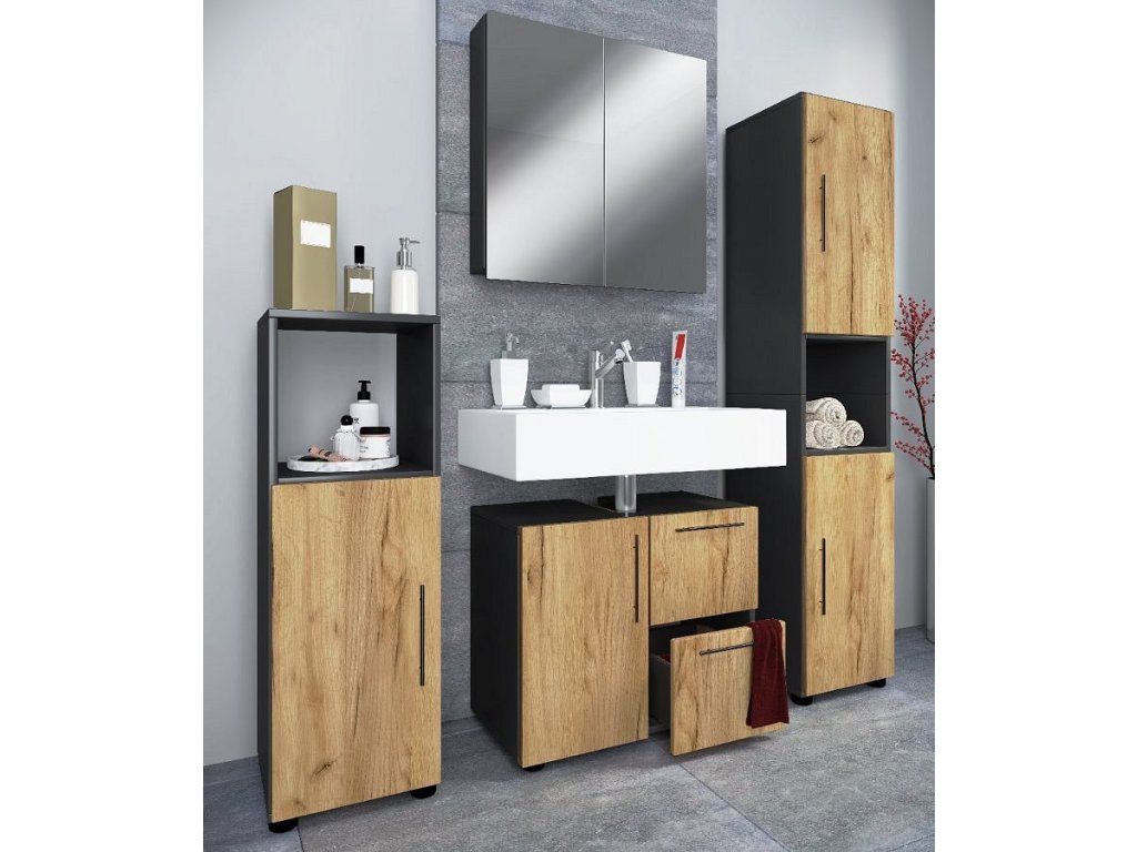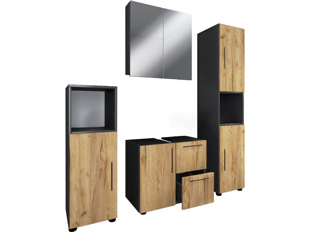 Hlavní vlastnosti: Sada se skládá z: - Koupelnová skříňka pod umyvadlo „Flandu“ - Midi skříňka „Flandu“ - Vysoká skříňka „Flandu“ - Zrcadlová skříňka Flandu" Koupelnová skříňka pod umyvadlo „Flandu“: - 2 zásuvky s hladkým výsuvem - Jedna dvířka - Rozměry cca v. 51 x š. 61 x h. 32 cm - Jednoduchá montáž - reprodukce struktury dřeva Midi skříňka „Flandu“: - Jedna otevřená police - Jedna velká dvířka - Rozměry cca v. 93 x š. 31 x h. 30 cm - Jednoduchá montáž - Reprodukce struktury dřeva Vysoká skříňka „Flandu“: - Jedna otevřená police - Dvoje velká dvířka - Rozměry cca v. 160 x š. 31 x h. 30 cm - Jednoduchá montáž - reprodukce struktury dřeva Zrcadlová skříňka Flandu": - Bezpečnostní sklo ESG - Dvoje dvířka se zrcadlem - Jedna variabilní dřevěná police - Reprodukce struktury dřeva - Stabilní a jednoduchá montáž na zeď - Rozměry cca v. 41,5 x š. 60 x h. 12 cm Tato moderní kombinace koupelnového nábytku nabízí spoustu úložného prostoru a udržuje pokoj uklizený. Elegantní a klasický design se hodí do každé koupelny.