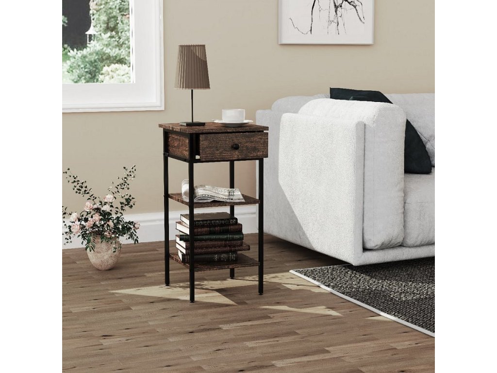 Hlavní vlastnosti: - Speciální kus nábytku do ložnice nebo obývacího pokoje - Úložný prostor šetří místo díky dvěma otevřeným přihrádkám - Jedna zásuvka pro skrytý úložný prostor - Design v industriálním stylu - Rozměry cca v. 70 x š. 35 x h. 35 cm S odkládacím stolkem „Aulari“ designér vytvořil kus nábytku, který se může stát poutačem v každé místnosti. Praktický, přímočarý a přesto elegantní. Industriální vzhled černého železného rámu doplňuje rustikální dřevo a vytváří tak harmonickou směs stylů. Skvělý odkládací stolek nebo noční stolek se zásuvkou a dvěma otevřenými přihrádkami, který nabízí mnoho praktického využití. Od 70. let 20. století se VCM specializuje na design, výrobu a distribuci nábytku s férovým poměrem cena/výkon a již zkrášlil miliony domácností.