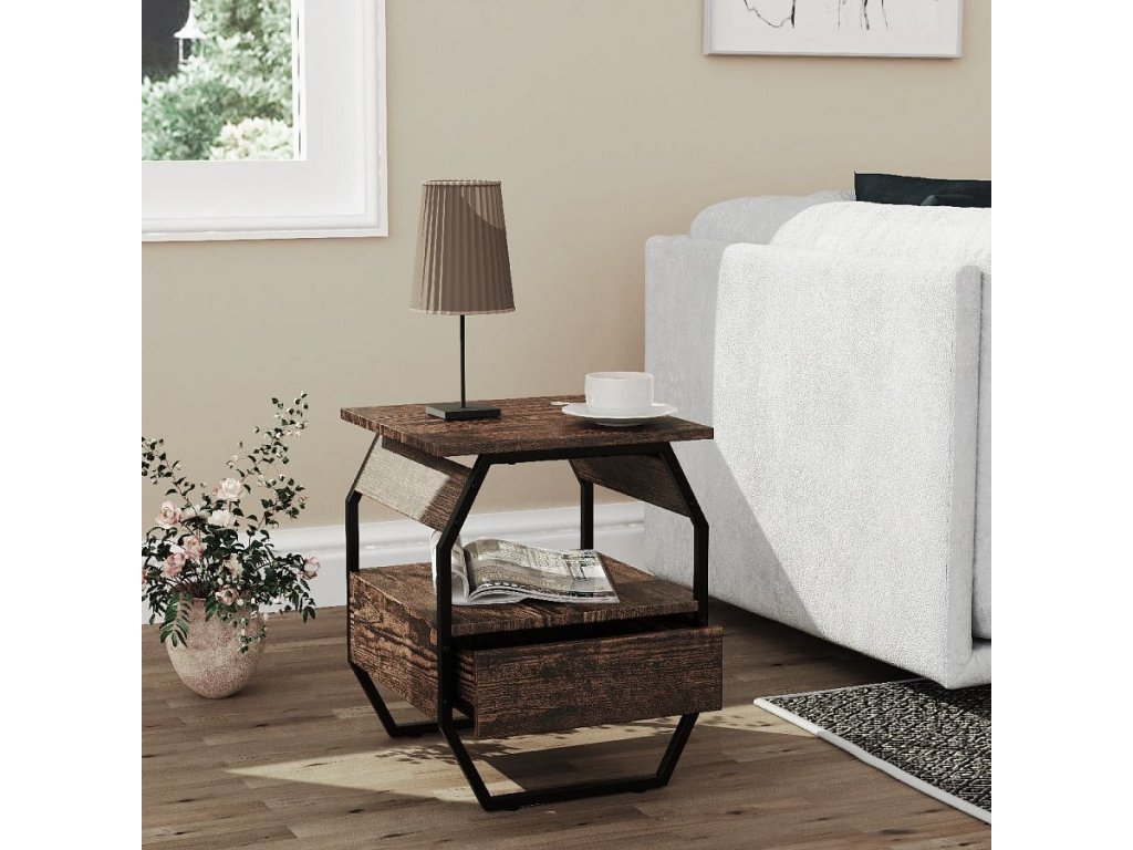 Hlavní vlastnosti: - Speciální kus nábytku do ložnice nebo obývacího pokoje - Úložná plocha šetří místo - V industriálním stylu - Rozměry cca v. 50 x š. 40 x h. 40 cm S odkládacím stolkem „Aulari“ designér vytvořil kus nábytku, který se může stát poutačem v každé místnosti. Praktický, přímočarý a přesto elegantní. Industriální vzhled černého ocelového rámu doplňuje rustikální dřevo a vytváří tak harmonickou směs stylů. Skvělý odkládací stolek nebo noční stolek se zásuvkou a otevřenou přihrádkou, který nabízí mnoho praktických využití. VCM se specializuje na design, výrobu a distribuci nábytku s férovým poměrem cena/výkon od 70. let 20. století a již zkrášlil miliony domácností.